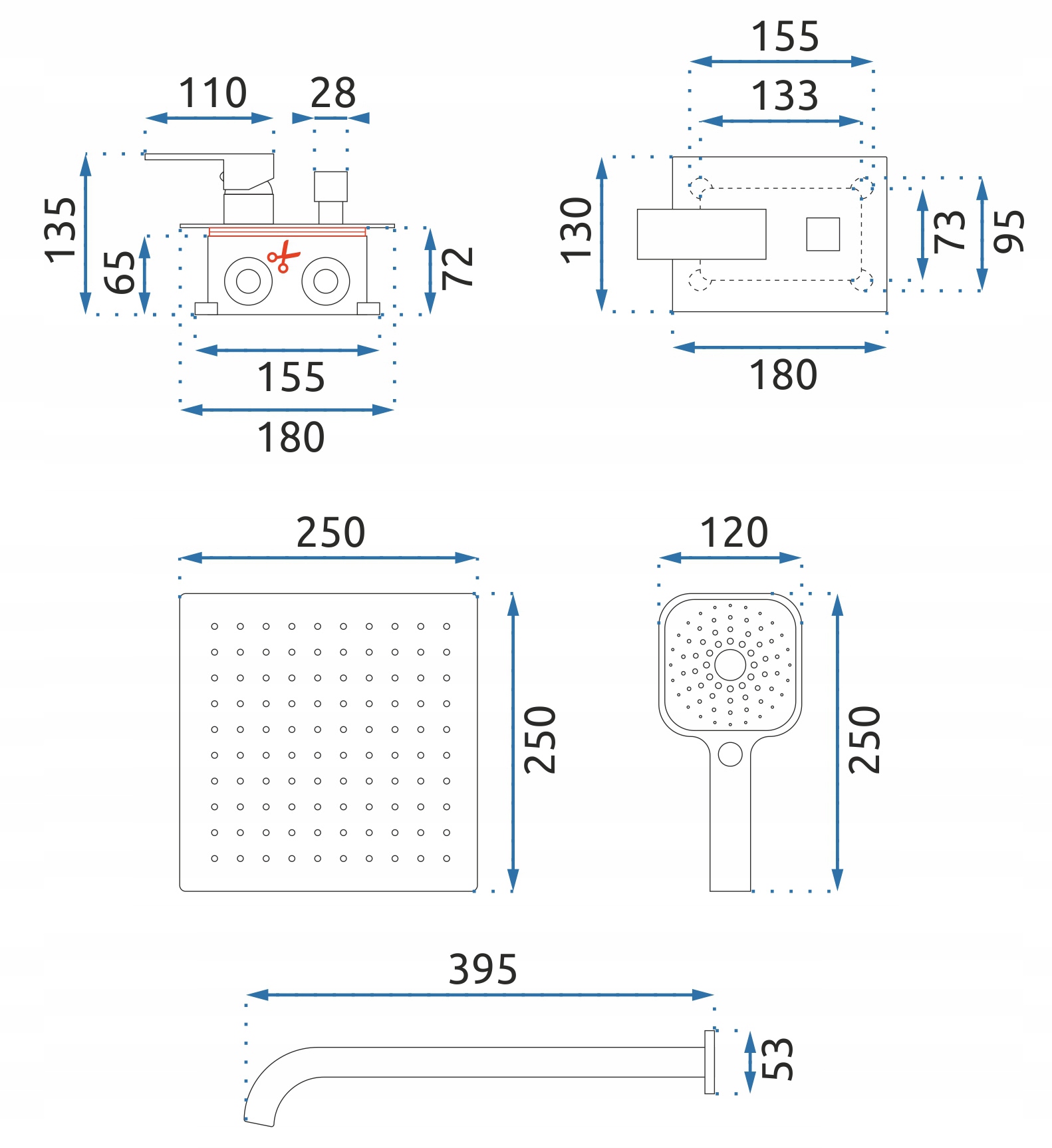 - Дождевой душ+ кронштейн + смеситель +трубка +шланг +коробка для легкой установки