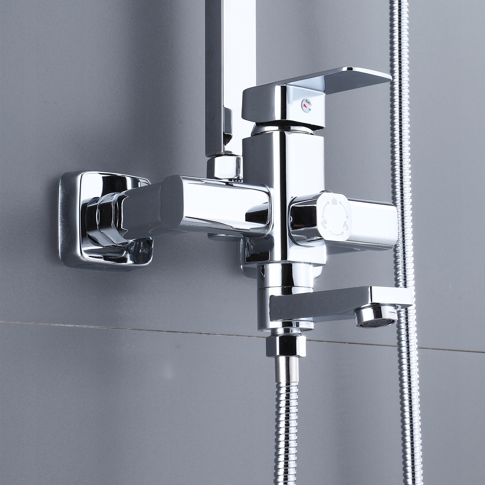 - Душевой набор с механическим смесителем с температурным смесителем и переключателем потока воды между тропическим душем, приемником и изливом.