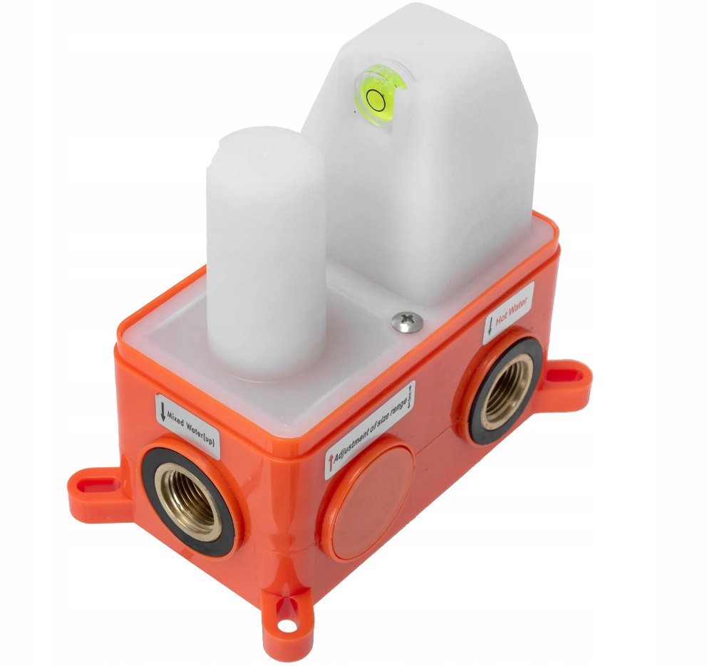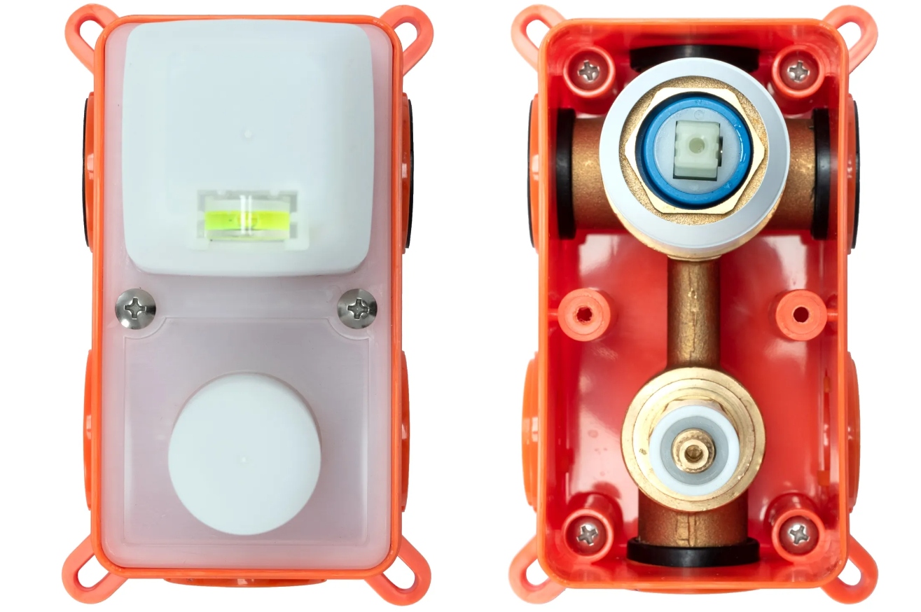 Представляем инновационную систему Box для установки смесителя скрытого монтажа. Система обеспечивает удобный и быстрый монтаж. Он изготовлен из пластика и латунных внутренних элементов, что гарантирует высокое качество и надежность. Элемент оснащен маскировочной частью, защищающей внутренние элементы при сборке, и уровнем, облегчающим правильную и точную сборку. Система обеспечивает легкий доступ к внутренним компонентам аккумулятора после установки для целей технического обслуживания.