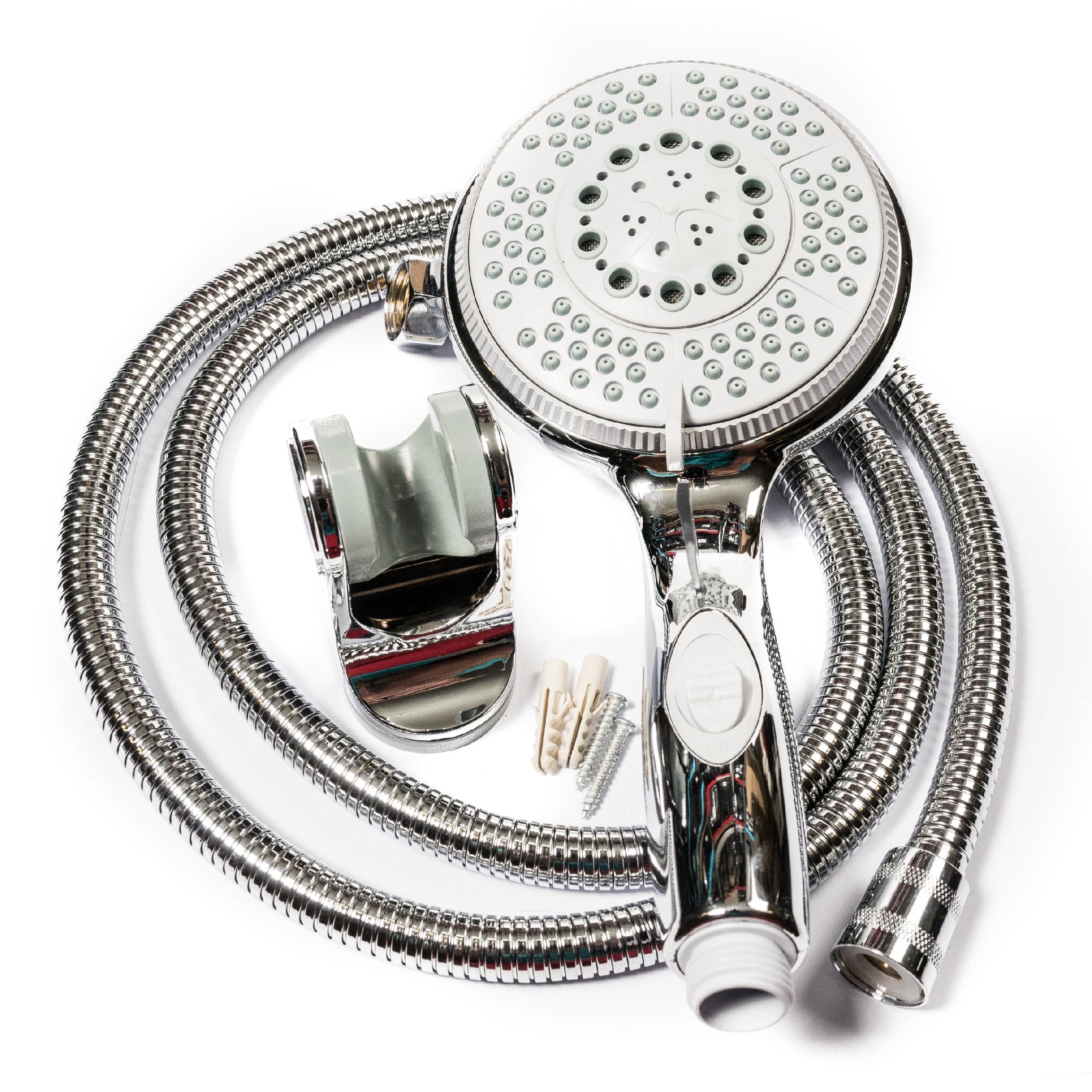 В комплект входит массивная душевая лейка с 5 функциями. Телефон выполнен из пластика, покрытого полированным хромом. Существенным преимуществом предлагаемой насадки для душа является функция старт-стоп, которая позволяет удобно останавливать струю воды, не отключая аккумулятор.