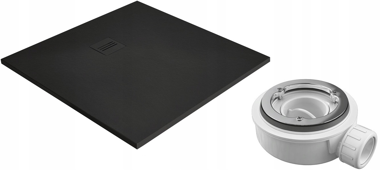 Предмет продажи - квадратный душевой поддон KYNTOS C 90x90x3x1,7cm черного цвета с сифоном HS1 Душевой поддон изготовлен из мраморного конгломерата, очень неглубокий, предназначен для установки непосредственно на пол. Возможно изготовление душевого поддона по индивидуальным размерам.