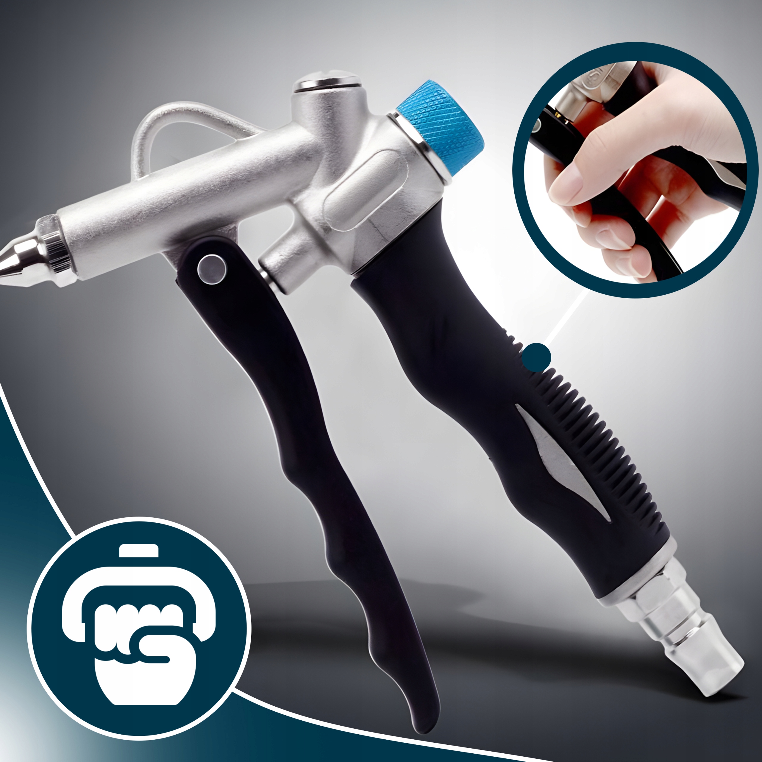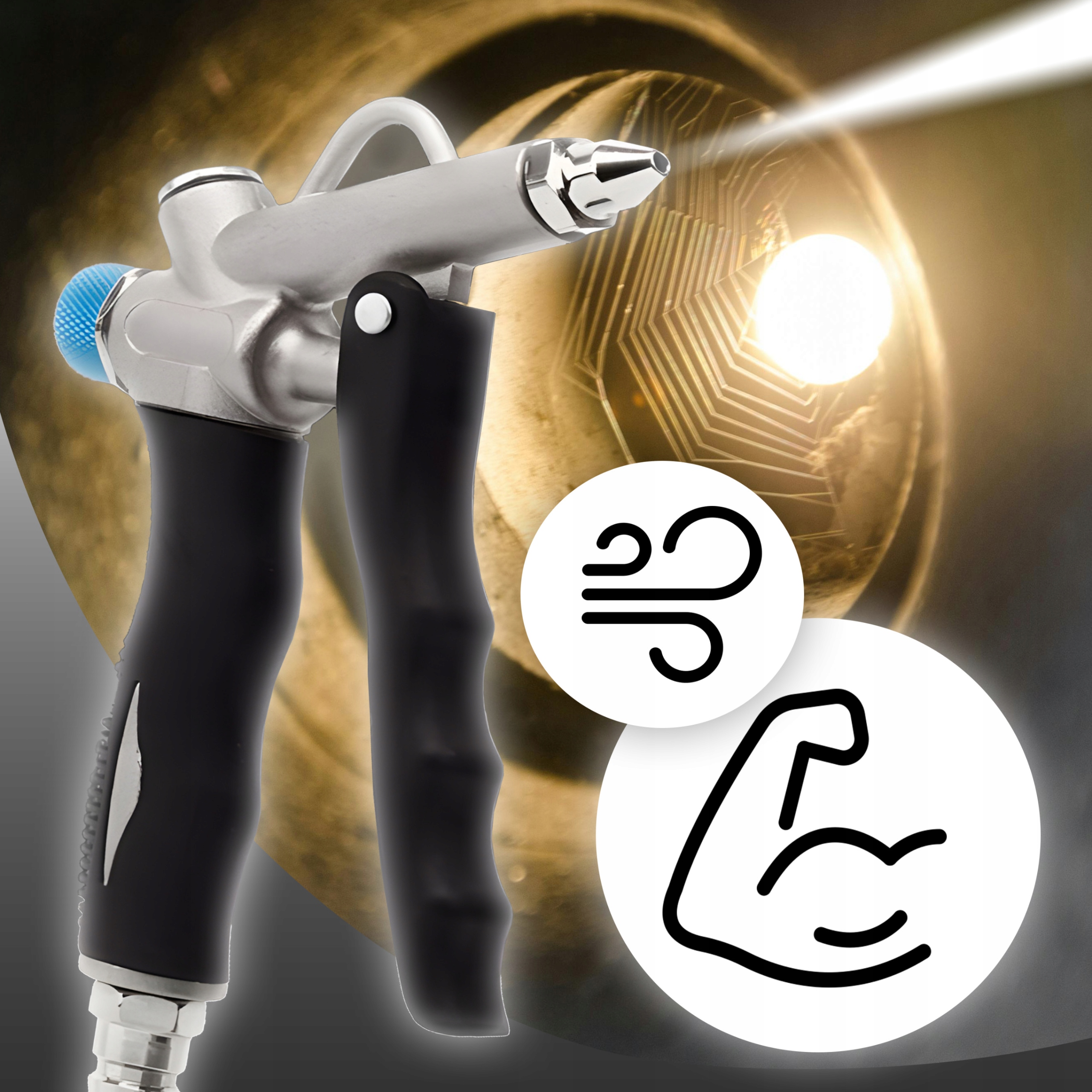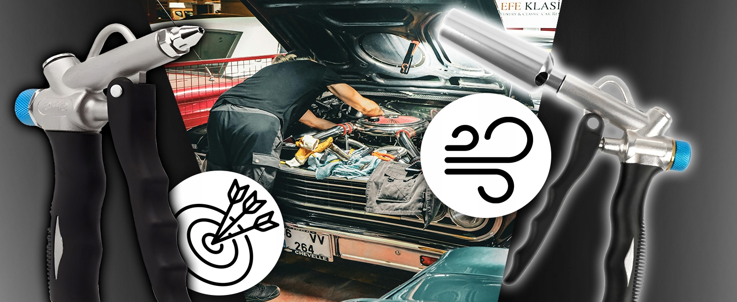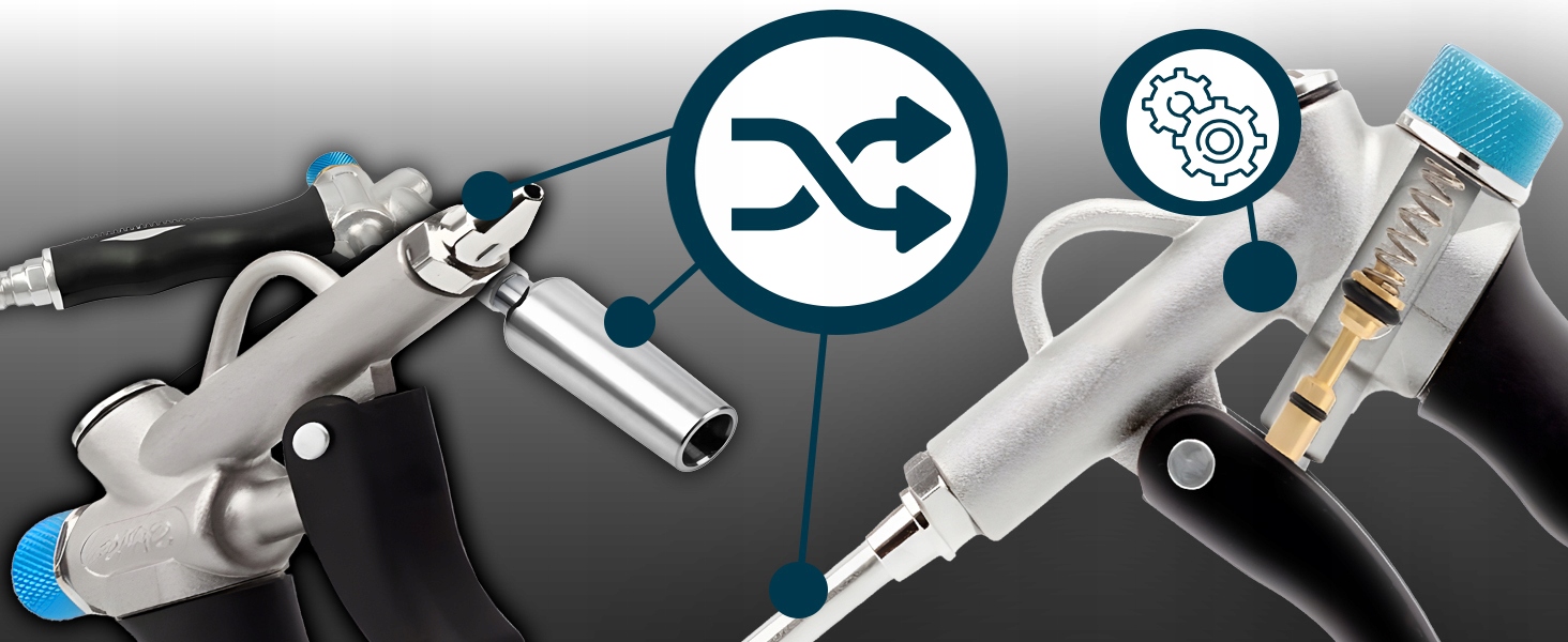 Продувочный пистолет оснащен соплом Вентури, которое позволяет эффективно и продуктивно производить высокое давление воздуха.
