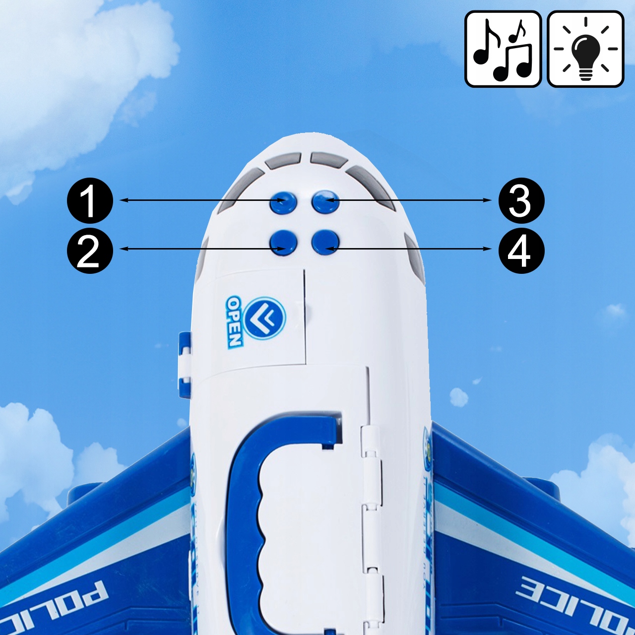 Duży Samolot Policyjny Z Napędem Transportowy Otwierany Dźwięki LED 3 Auta