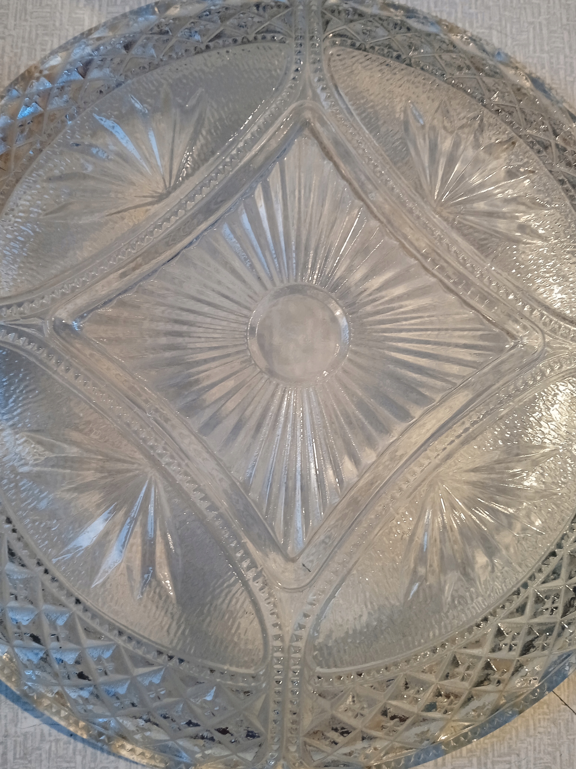 Предлагаю на продажу большую тарелку - блюдо, выполненное в стиле модерн из прозрачного прессованного стекла. Табличка производства Гортенского металлургического завода, № 127 в каталоге 1936 года, но изготовлена раньше - начала ХХ века. Состояние хорошее, без видимых повреждений. Диаметр 30 см. Тарелка, украшенная ромбовидным узором и гирляндами.