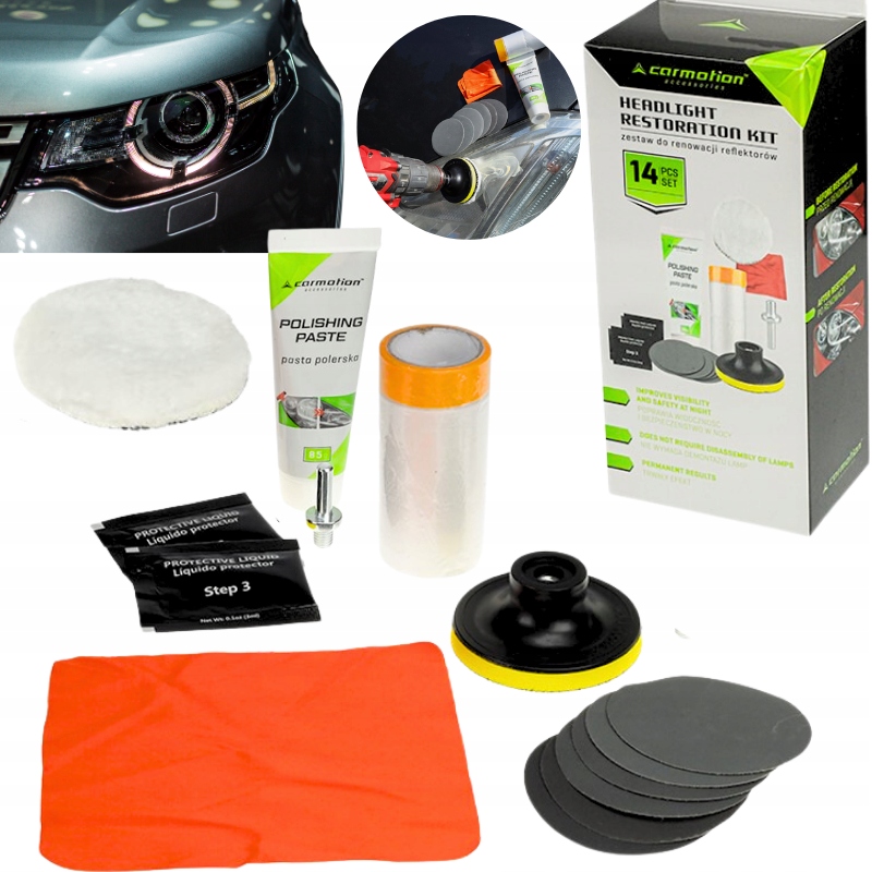 DUŻY ZESTAW DO RENOWACJI POLEROWANIA REFLEKTORÓW LAMP SAMOCHODOWYCH 14EL.