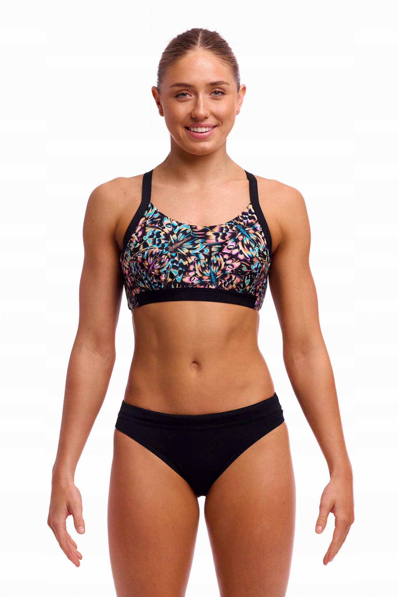 Funkita Sports Top, имеет плоские, гибкие и съемные чашки и разбитые в середине, что обеспечивает комфортное складывание наряда. Эта вершина обеспечивается комфортом и поддержкой в бюста, во время физической активности как в воде, так и на пляже.