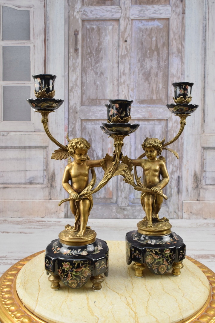 Два чорних свічника - порцеляна + бронзова фігура - фігурки ангелів Аморі