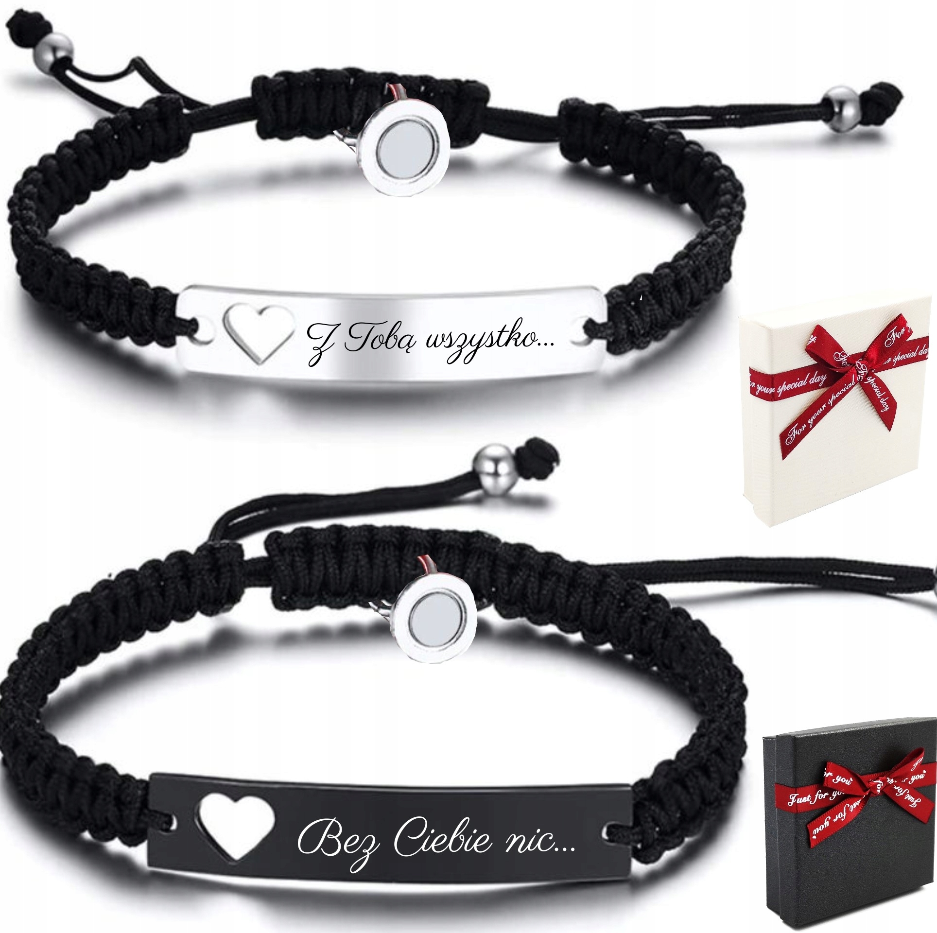 Элегантные, стильные браслеты для пар, друзей, влюбленныхиз высококачественной нитки нейлона. Черные струны соединены с пластинами из изготовлены из высококачественной нержавеющей стали 316L, также известной как нержавеющая сталь, ювелирная сталь или хирургическая сталь. Таблички с высоким глянцем, идеальной полировкой и блестящей отделкой на внешней и внутренней сторонах адаптированы для персонализации путем выполнения индивидуальной гравировки (на оборотной и лицевой стороне) , что сделает изделия уникальными. Глубокий черный цвет одной из пластин обусловлен прочным методом ионного анодирования. Кроме того, каждый браслет украшен узором в виде сердца, вырезанным на стальном элементе с левой стороны. Изделия также можно регулировать по размеру, регулируя с помощью шнурка.