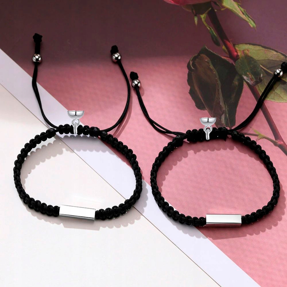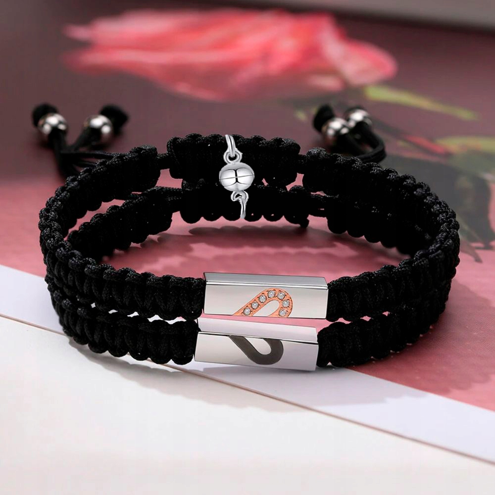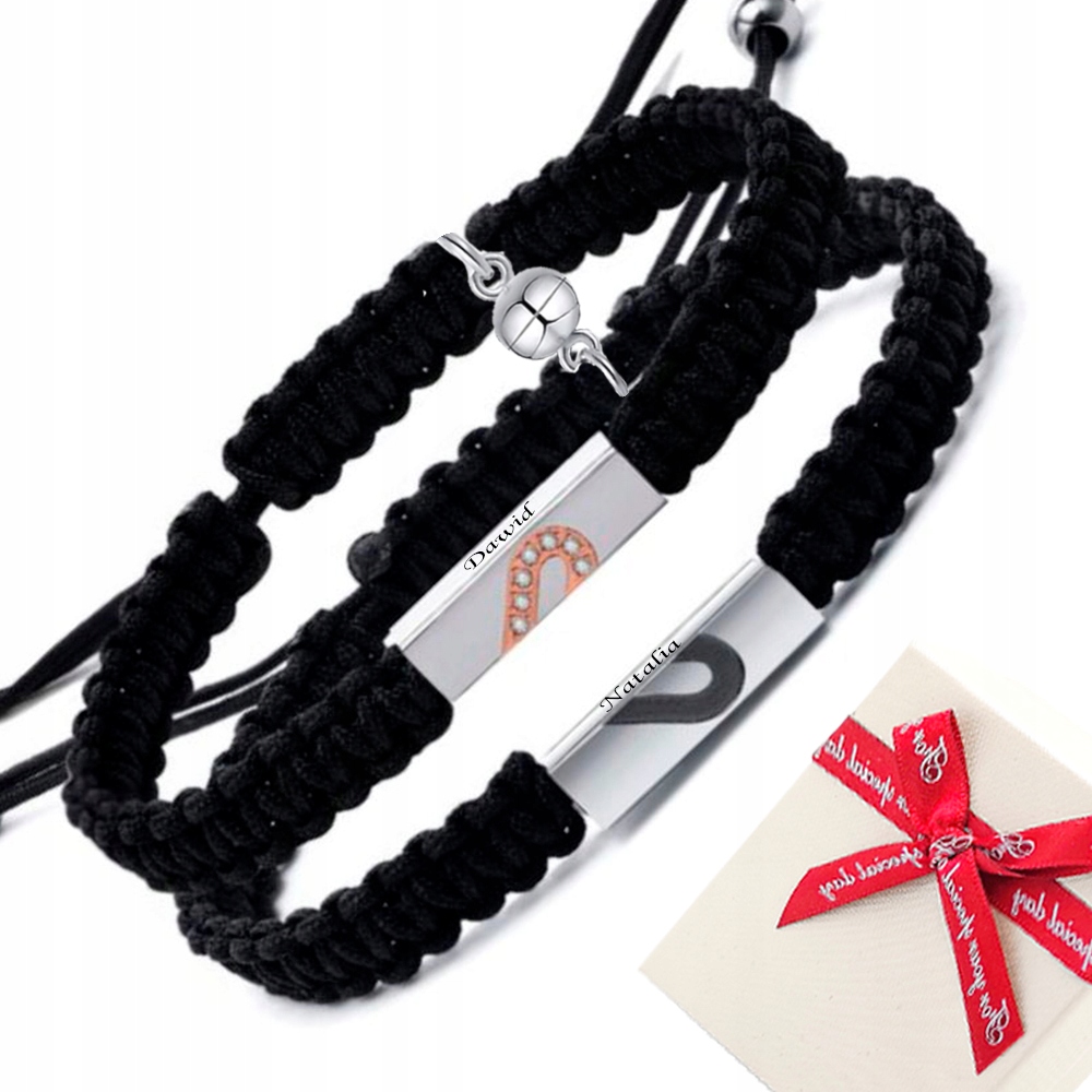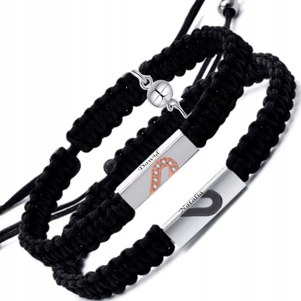 Элегантные, стильные браслеты для пар, друзей или влюбленных, изготовленные из высококачественной плетеной нейлоновой нити черного цвета. Браслеты дополнены пластинкой с символом половины сердце, а его внутреннюю, гладкую часть можно использовать для персонализации. Металлические элементы изготовлены из высококачественной нержавеющей стали, также известной как нержавеющая сталь, ювелирная сталь. или хирургическая сталь. Блестящие детали, идеально полированная и блестящая поверхность. Размер можно регулировать, регулируя его специальной плетеной веревкой. Дополнительно браслеты оригинальны за счет наличия магнитов, которые при приближении заставляют украшения соединяться, создавая потрясающий эффект любовного притяжения. Такие украшения непременно станут прекрасным дополнением вашего гардероба, подчеркнув ваши уникальные отношения. Все это не только станет идеальным украшением для ваших запястий, но и будет иметь сентиментальную ценность. Их уникальный и неповторимый дизайн делает их идеальными подарком на такие случаи, как День святого Валентина, юбилей, день рождения, именины.