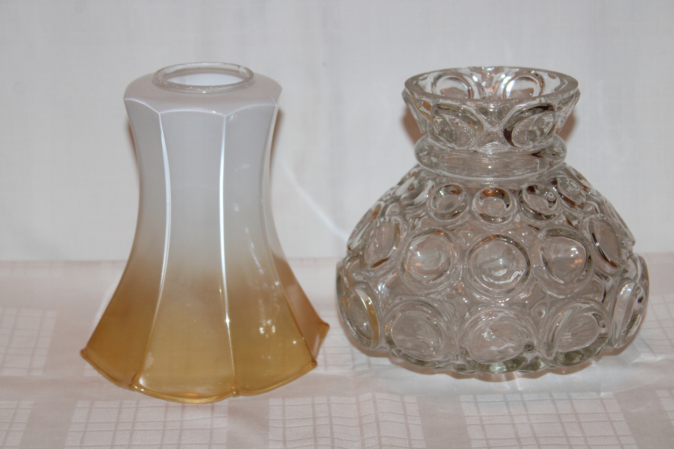Два абажура. Двухцветное из тонкого стекла, поврежденное, высота 14,5 см; диаметр 13 см; проем 4,3/4,9 см.