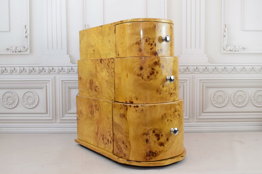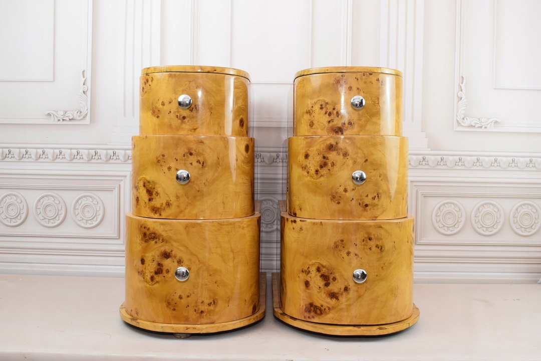 Мы представляем набор из двух питательных/столов/столов/прикроватных в стиле ар -деко, оснащенных тремя ящиками в каждом. Эта элегантная мебель сочетает в себе функциональность с эстетикой, характерным для периода ар -деко, внедряя в интерьер изысканный стиль и роскошь.