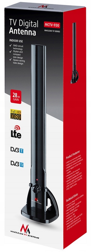 Активная антенна комнаты от Maclean MCTV-930 b> может получать как аналоговое, так и цифровое телевидение и радиопрограммы. DVB-T2, ISDB-T и DMB-T / H, ATSC. Он также подходит для получения цифрового радио DAB, а также аналогового радио FM.