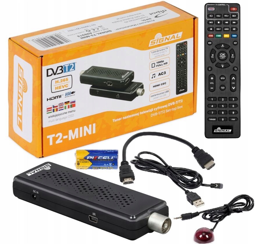 Устройство Signal T2-MINI принимает каналы, транслируемые на цифровом эфирном телевидении DVB-T2, с использованием технологии кодирования изображения< b >HEVC (H.265/MPEG-H) и H.264/MPEG-4 со звуком Dolby E-AC-3.