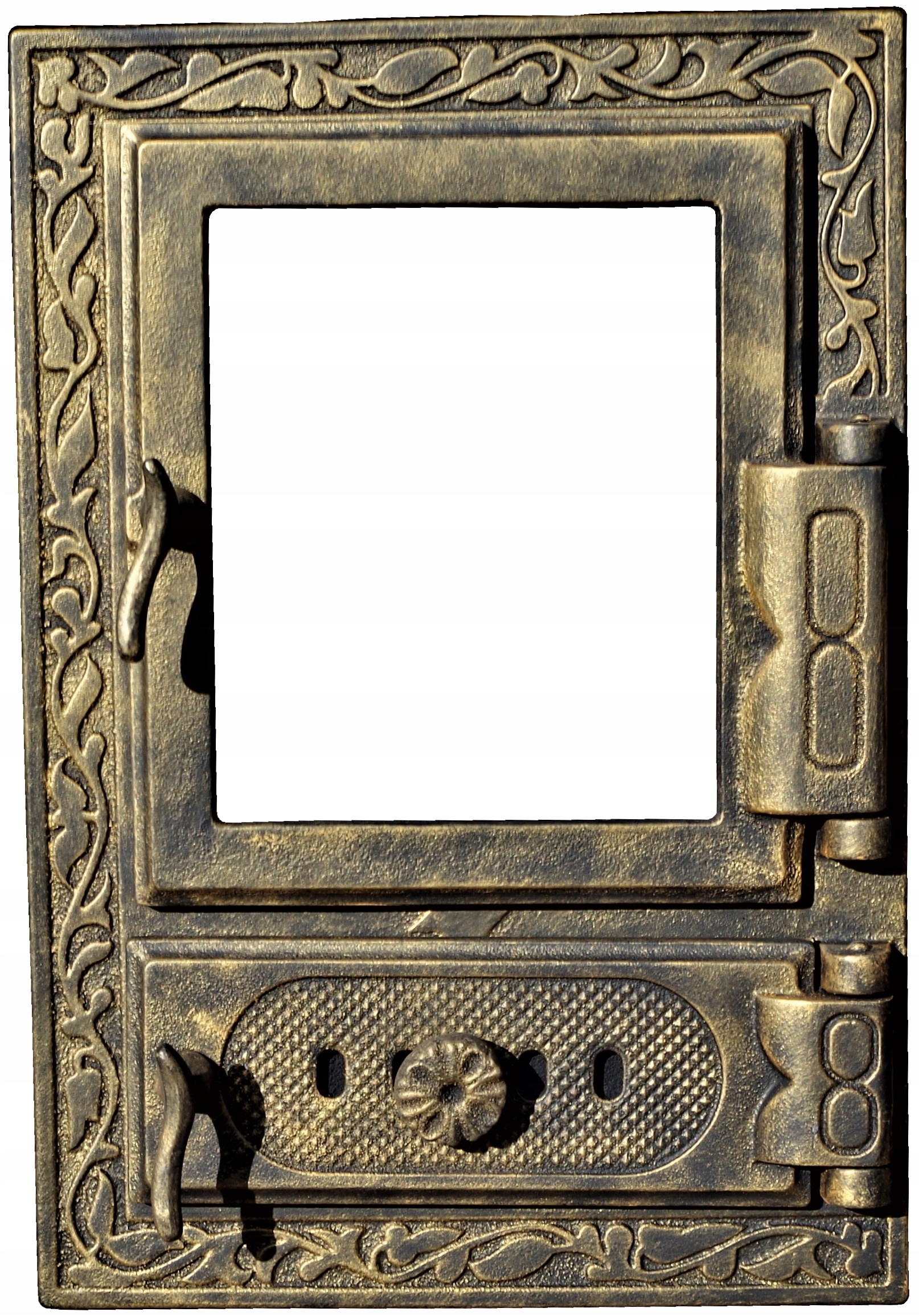 Чугун патинирован в цвет из старого золота термостойкой краской при 900 градусах. Каждое изделие окрашивается индивидуально по желанию заказчика. Двери используются для строительства домашних коптилен, хлебных печей, каминов и т.п.