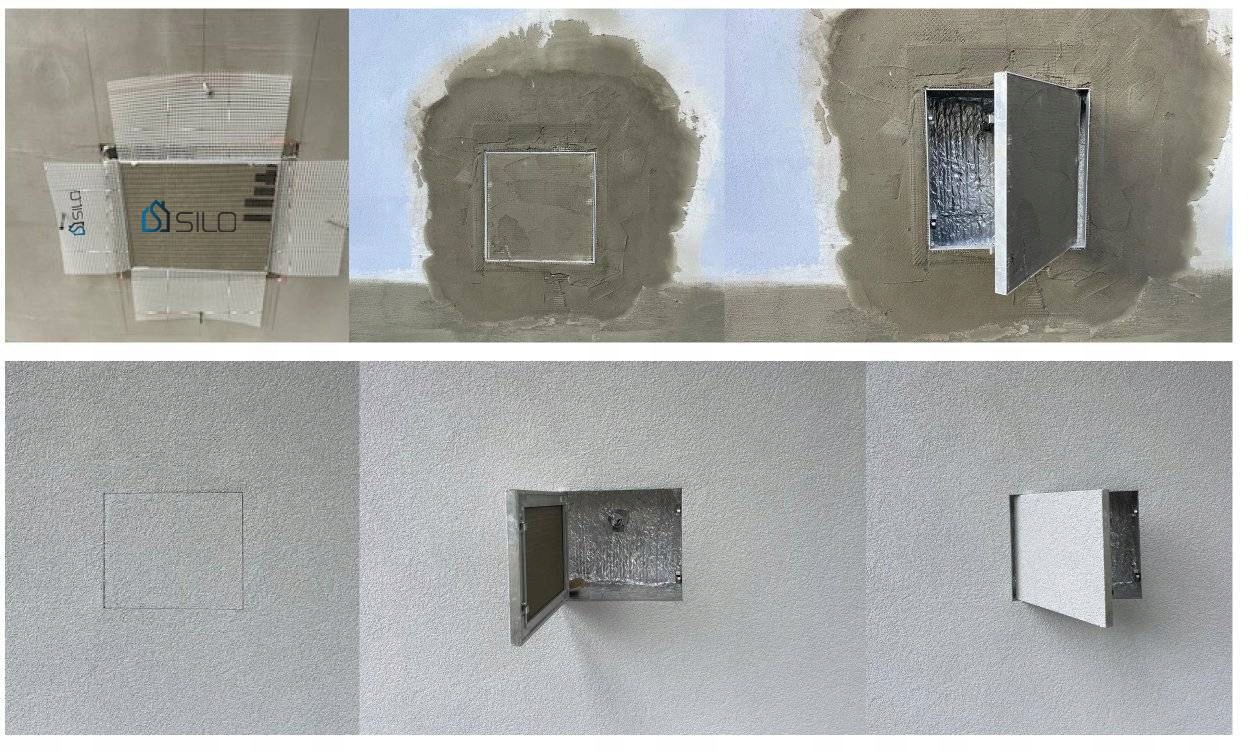 Для установки двери проделайте в пенопласте отверстие по размеру внутреннего часть двери, затем вырежьте по краю размер внешней части двери. Поместите дверь в ранее вырезанное отверстие так, чтобы она была на одном уровне с остальной частью пенопласта. Сложите сетку, прикрепленную к двери, наружу и поместите на нее сетку, использованную для фасада. Нанесите клей на оба слоя сетки. Благодаря использованию строительной плиты внутренняя часть двери после грунтования готова к нанесению штукатурки.