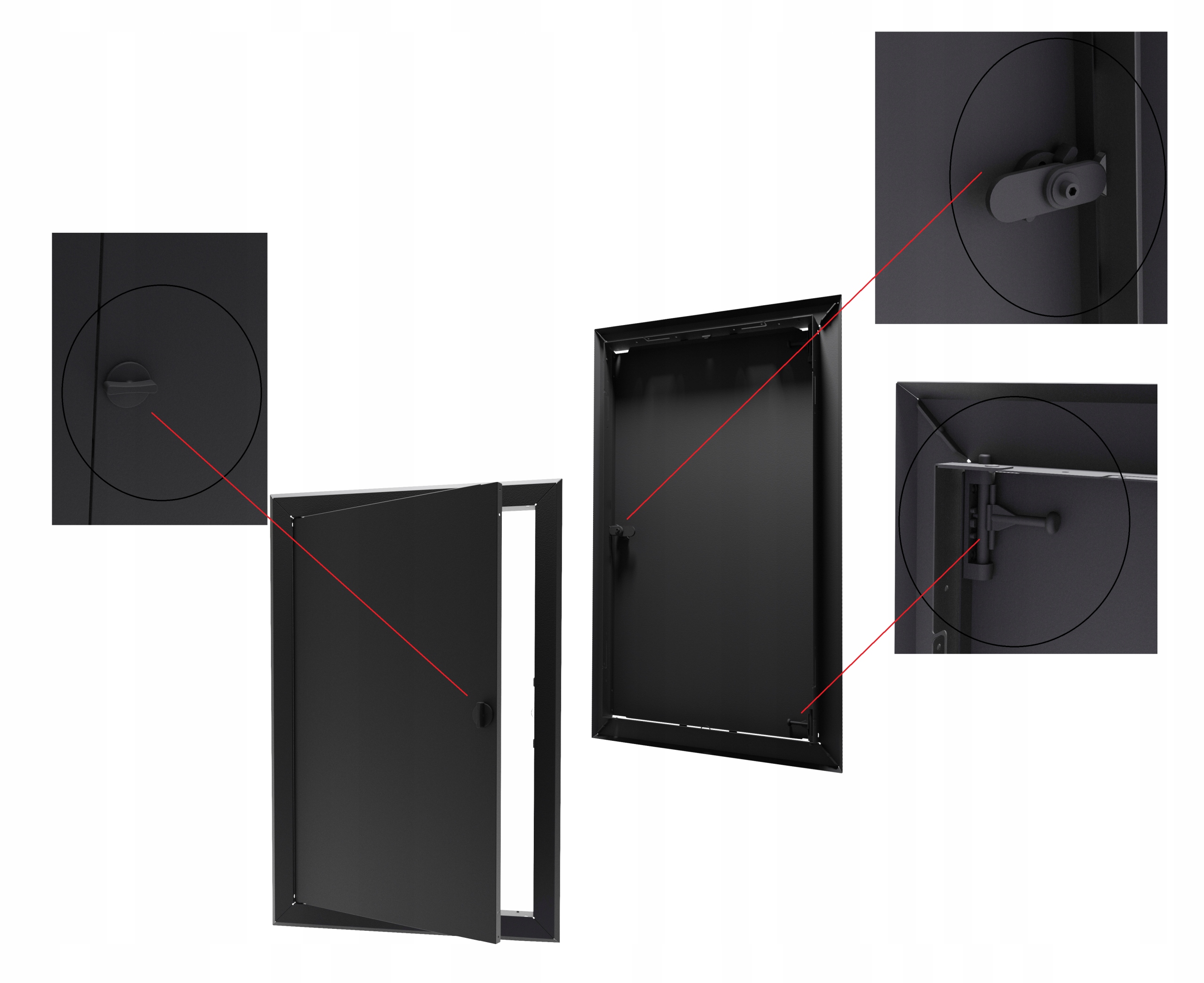 Дверь состоит из внешней рамы, которая скрывает недостатки отверстия доступа и подвижной внутренней рамки, соединенной съемными петлями. Благодаря съемным петлям можно удалить внутренние двери, что обеспечивает легкий доступ к внутренней части отверстия.