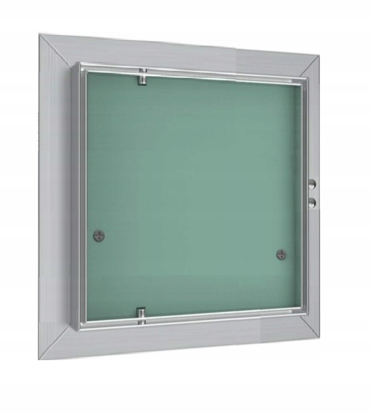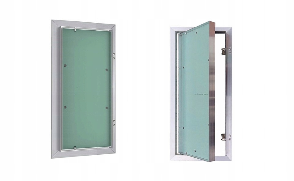 Ревизионные двери изготовлены из алюминиевых профилей, приваренных к внешней и внутренней раме. Вся конструкция соединена неподвижными петлями, позволяющими при необходимости открывать дверь в сторону. Данная модель оснащена зеленым водонепроницаемым гипсокартоном с пропиткой толщиной 12,5 мм.