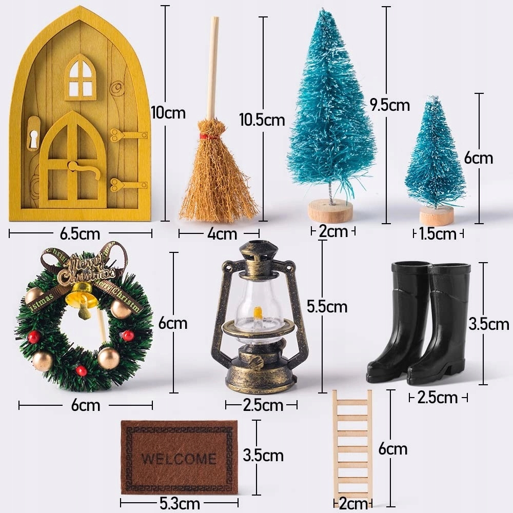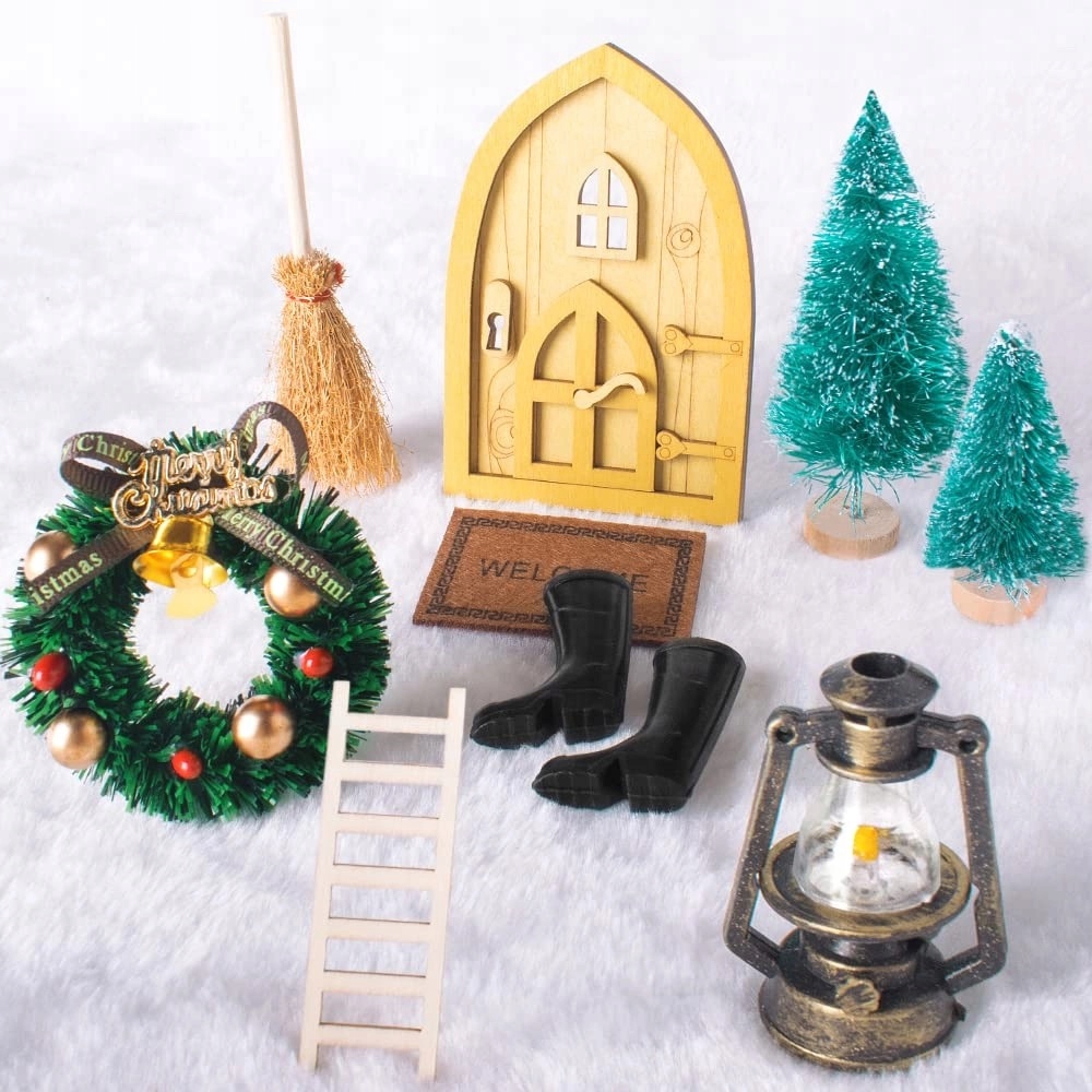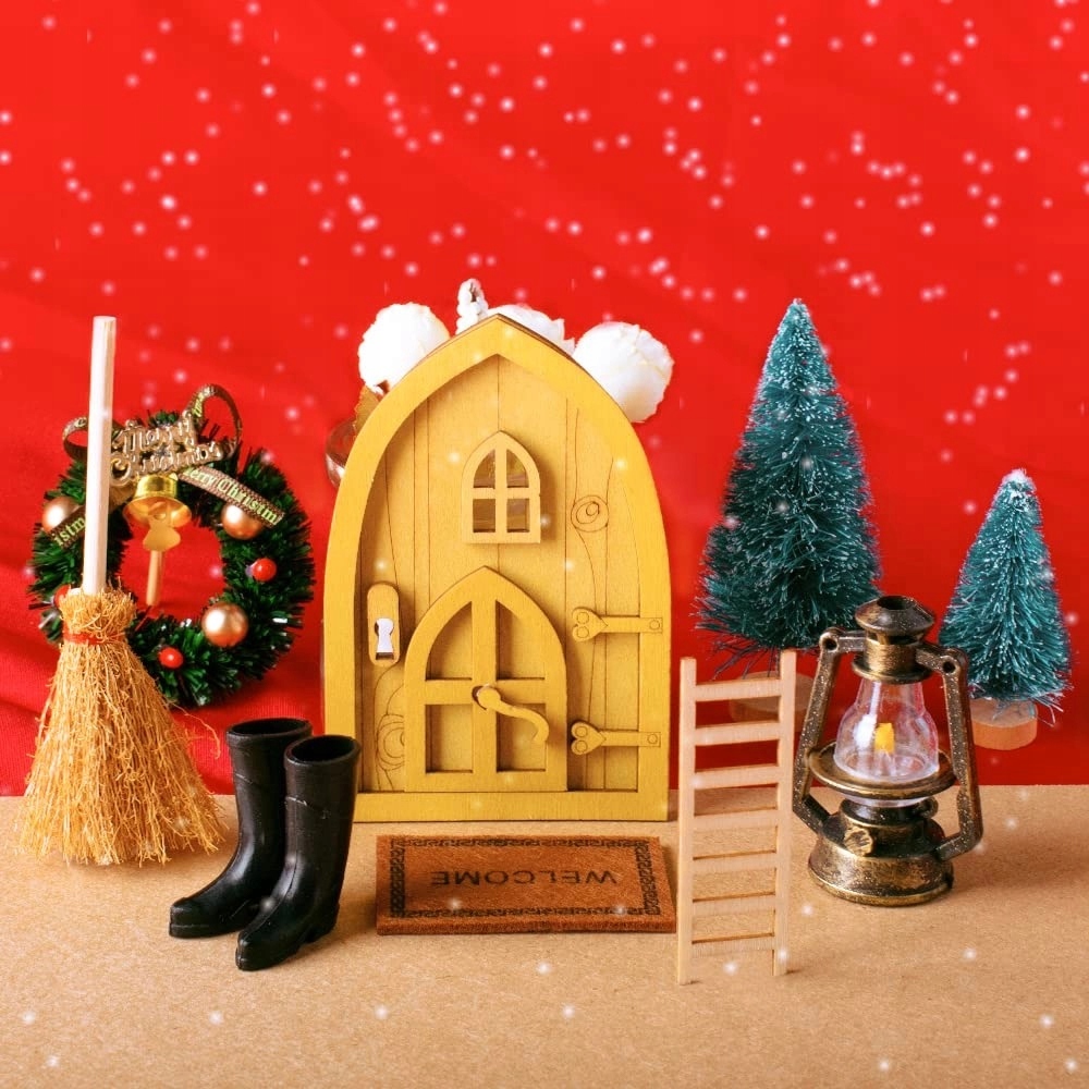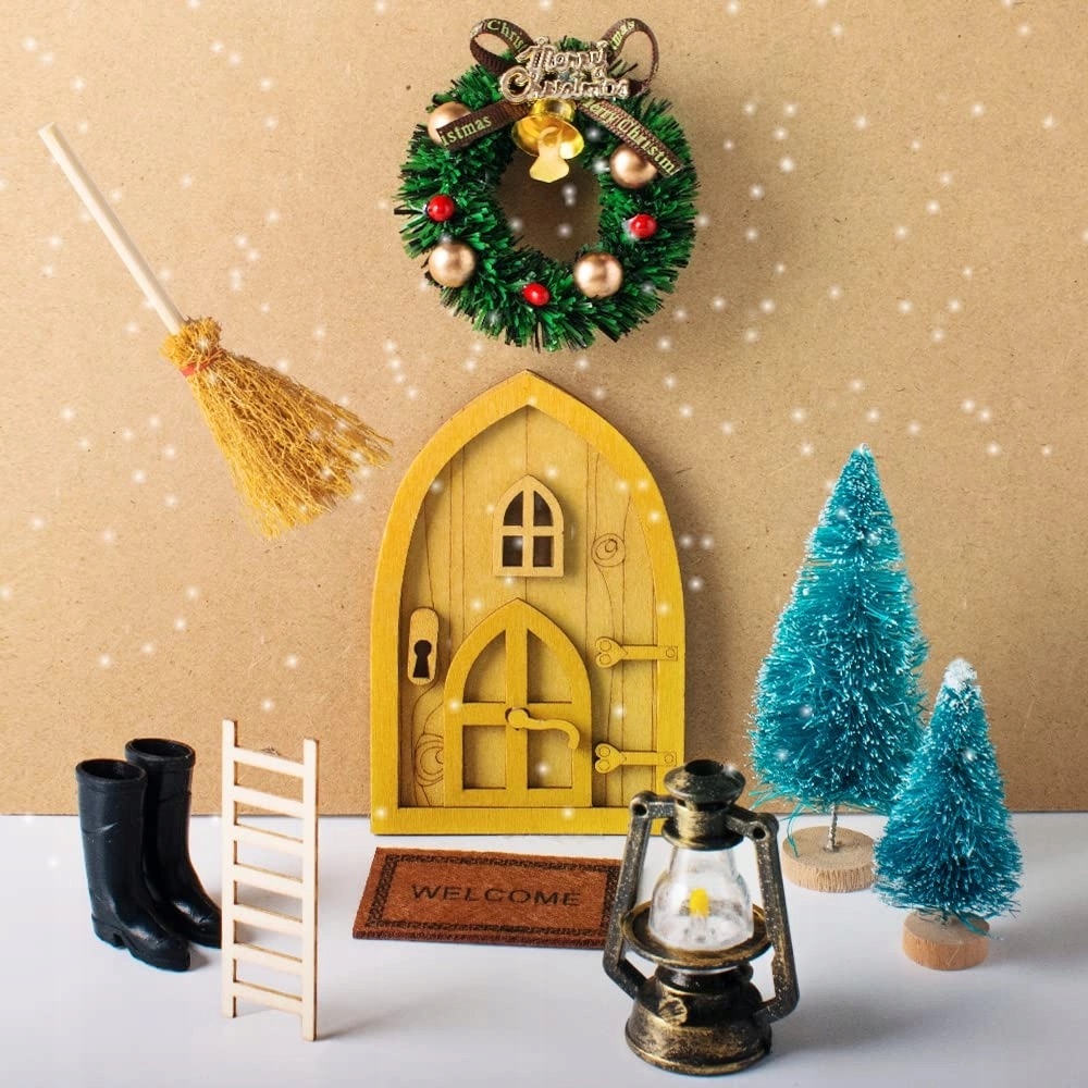 Рождественский набор, дверь гнома, дверь с 9 аксессуарами, рождественское украшение, миниатюрная дверь, метла гнома, елка, деревянная лестница, ковер, венок, фонарь