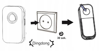 Снимите защиту аккумулятора с кнопки и подключите приемник к розетке 230 В ~ 50 Гц. После подключения приемника к розетке и одновременного воспроизведения звука «Дингдон» он запускается примерно на 30 секунд. процесс сопряжения передатчика с приемником. Нажмите кнопку звонка, и приемник издаст звук «Диндун», что означает, что сопряжение завершено.