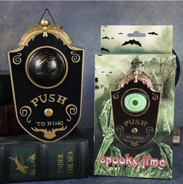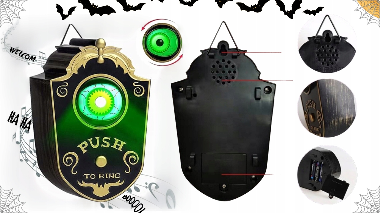 - Дверной звонок со страшным зеленым светом, 4 приветственными текстами и страшными звуками.