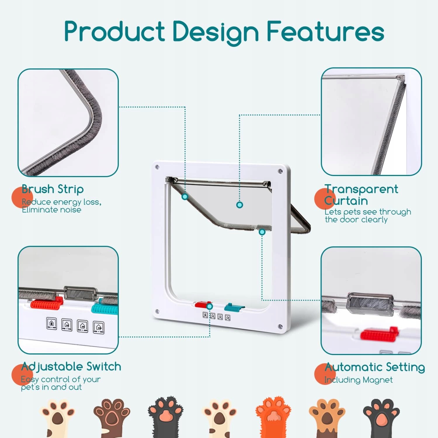 Кошачий лоскут из прочного пластика ABS легко чистить и молча работает благодаря щетковым ремням. Магнитное закрытие заставляет лоскут кошки возвращаться в исходное положение после использования. Ветрозащитный и защищает от драфта. Благодаря этому они не замораживают зимой или штормом осенью.