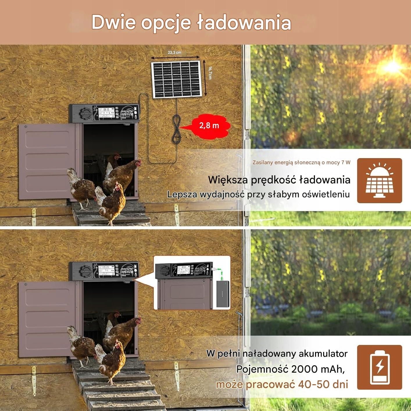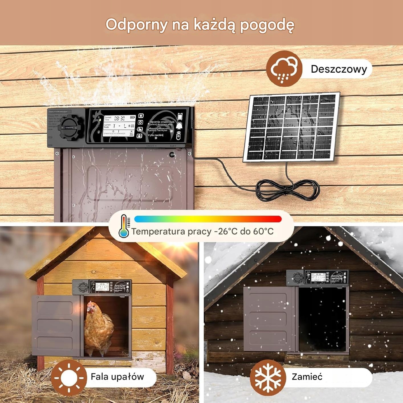 Механизм безопасности - встроенный датчик обнаруживает, есть ли препятствие в области двери, и сразу же прерывает процесс закрытия, чтобы предотвратить цыплята и обеспечить их безопасность