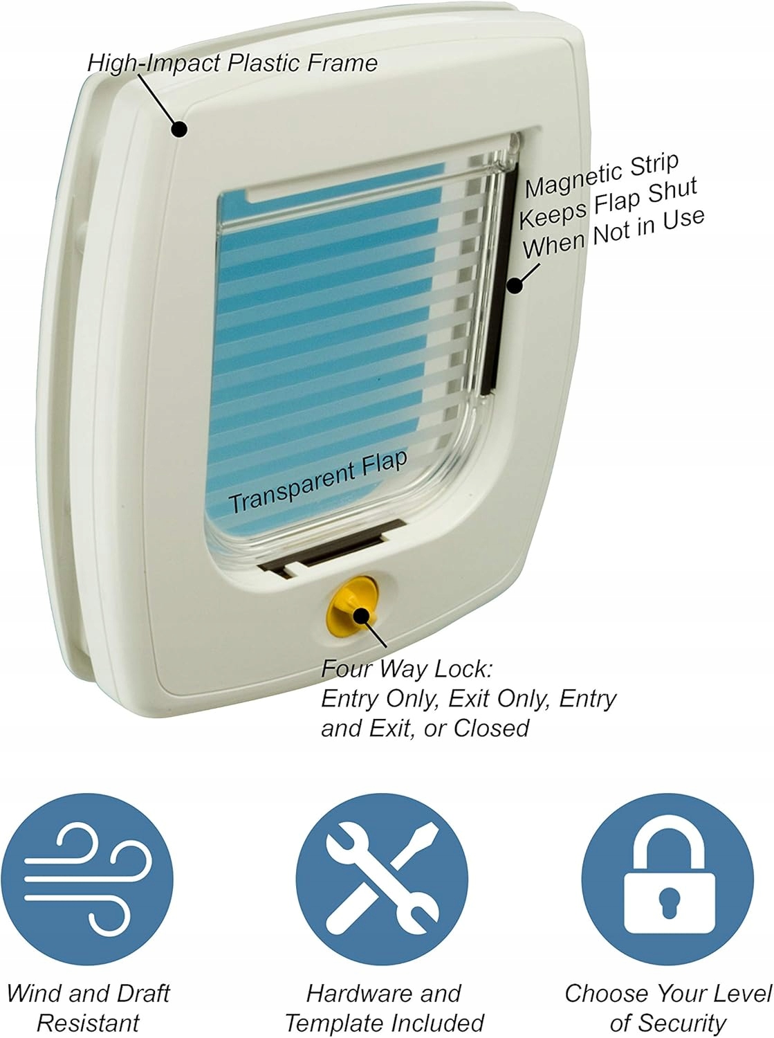 Удобная дверца для кошек оснащена поворотным замком с четырьмя ручками для режима «только вход», «только выход», «вход и выход» или режима закрытой двери, что идеально подходит для блокировки доступа вашей кошки или других нежелательных злоумышленников к двери вашего питомца
