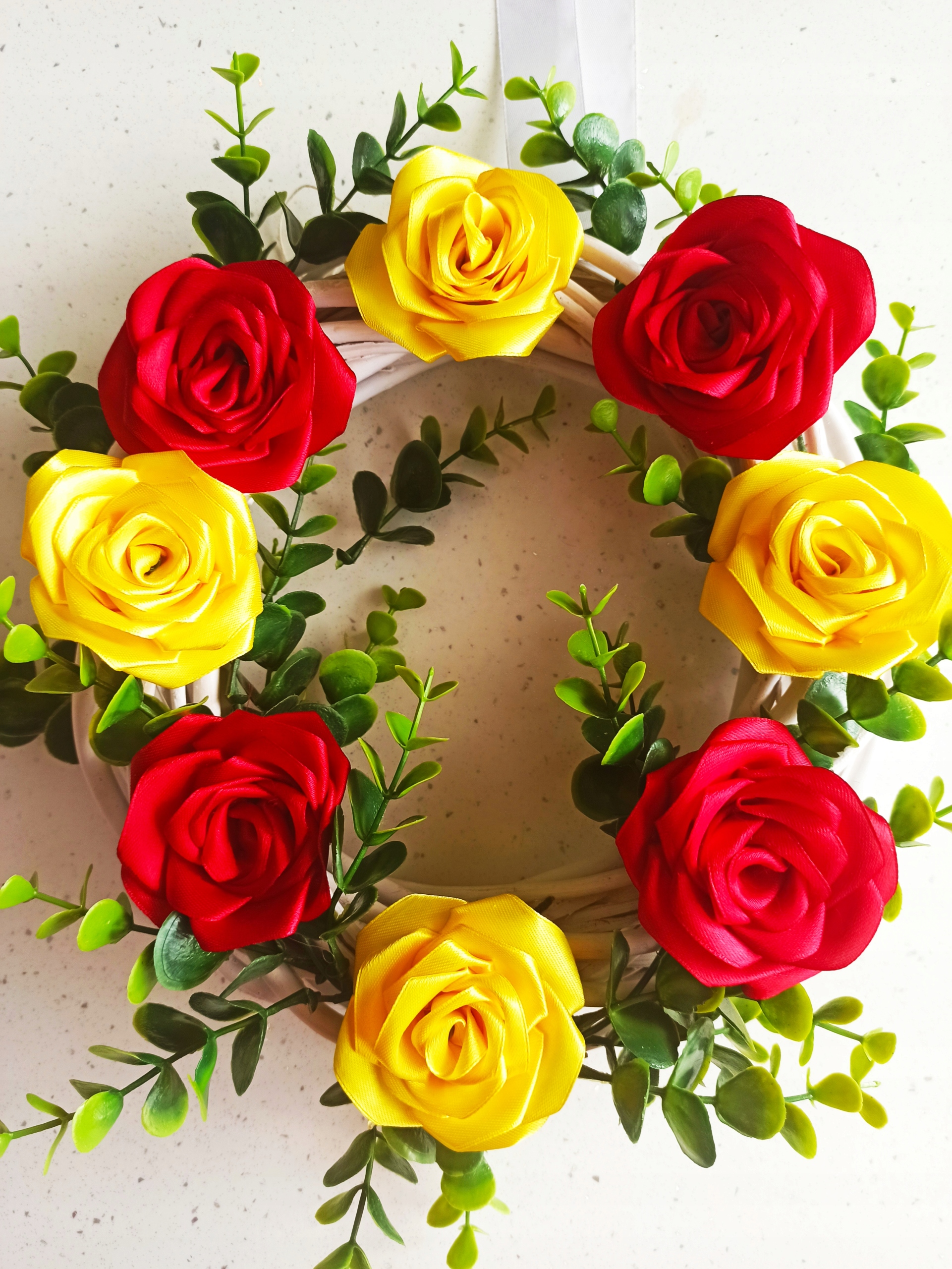 Венок на дверь декоративный. К плетеному кольцу были прикреплены желтые и красные розы и самшит. Цветы ручной работы из ленты.