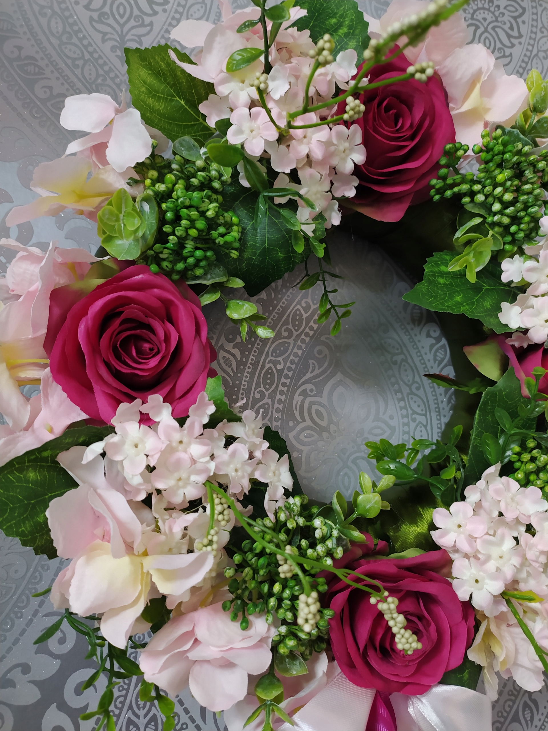- Основа венка: соломенный венок, обмотанный атласной лентой.
