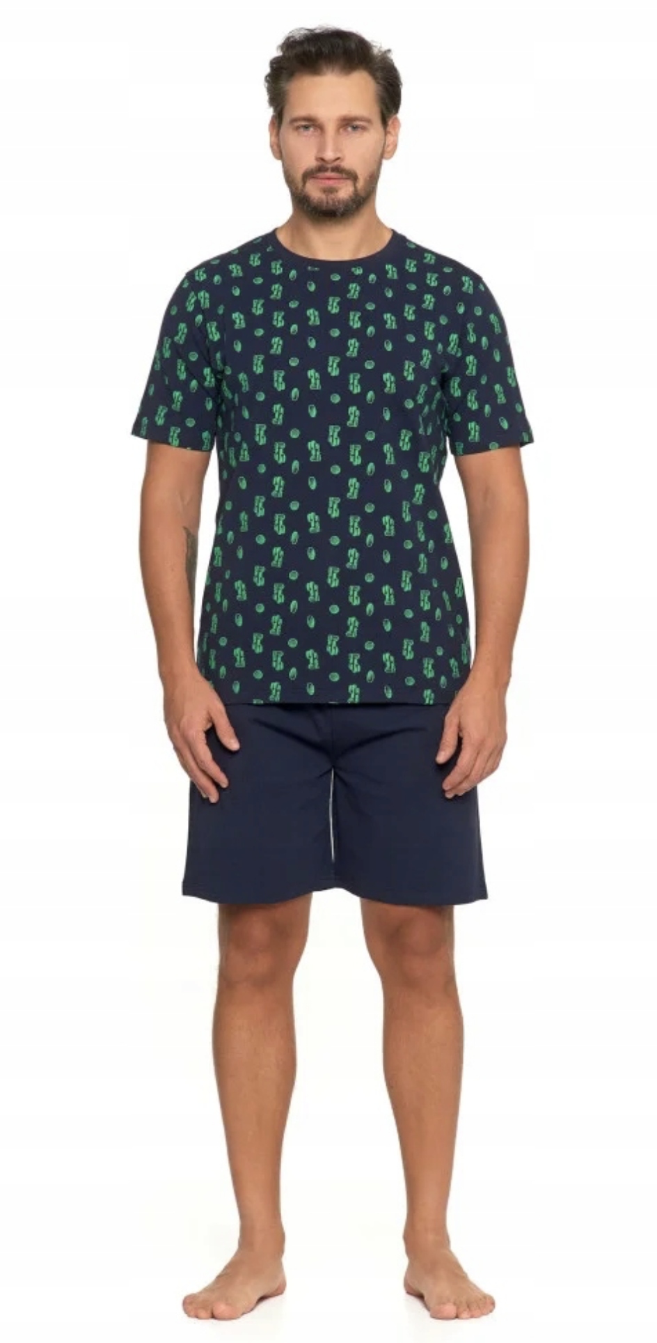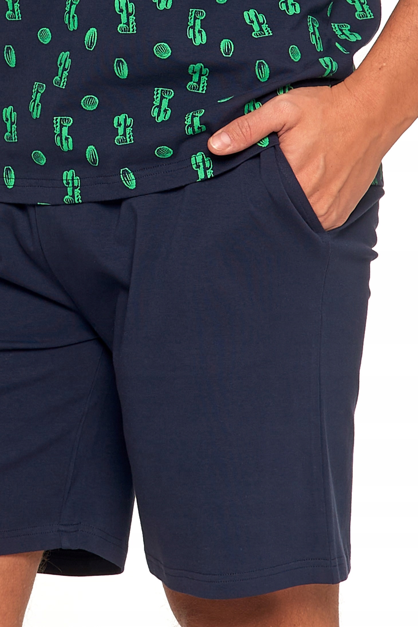 Мужская пижама с двумя брюками с короткими рукавами как Верхняя часть набора - темно -синяя рубашка с короткими рукавами - была украшена повторяющимся мотивом зеленых кактусов, что придает ему немного юмористический и праздник.