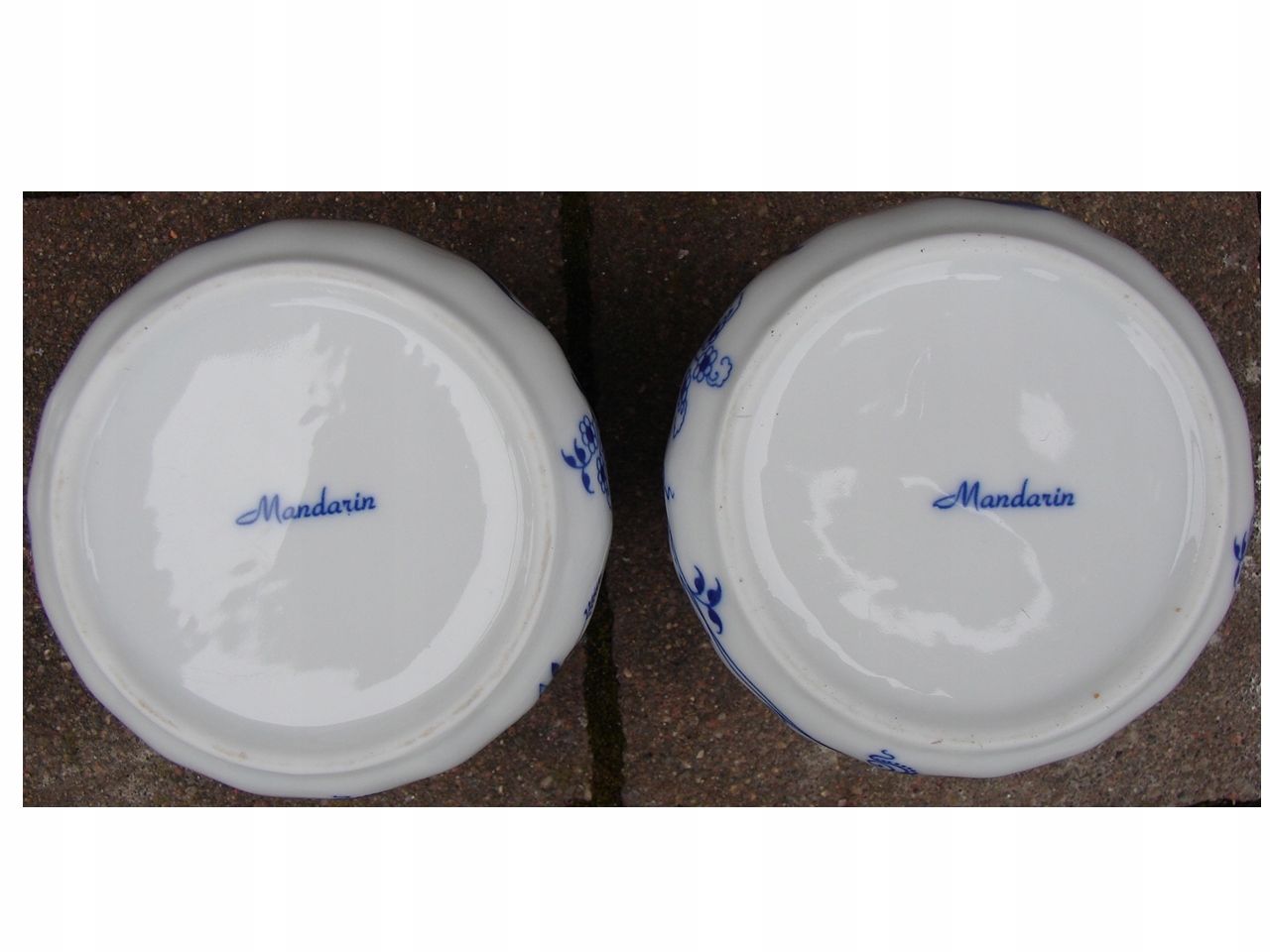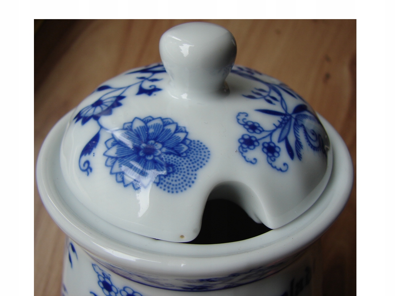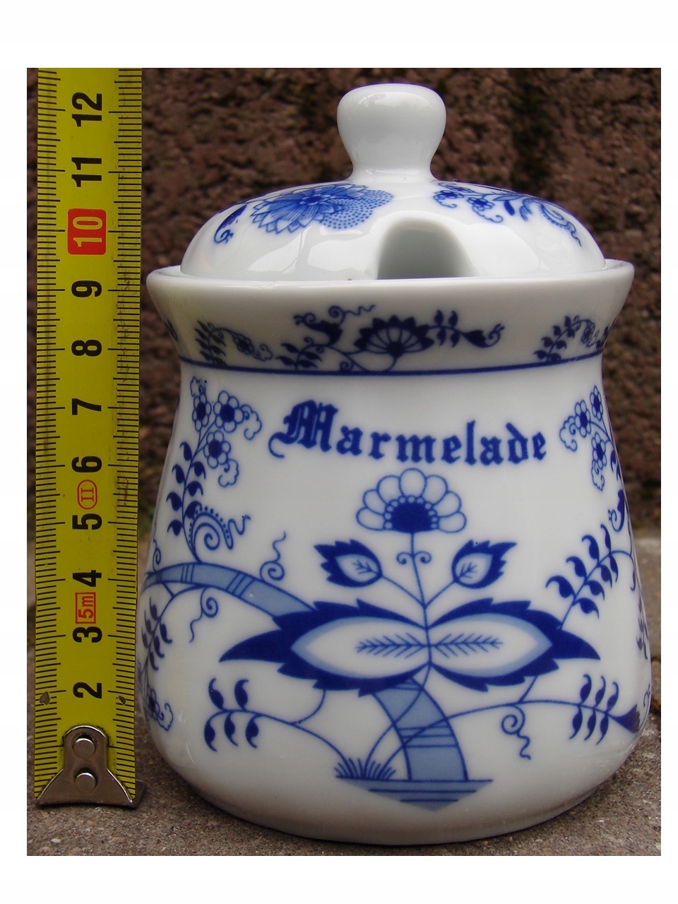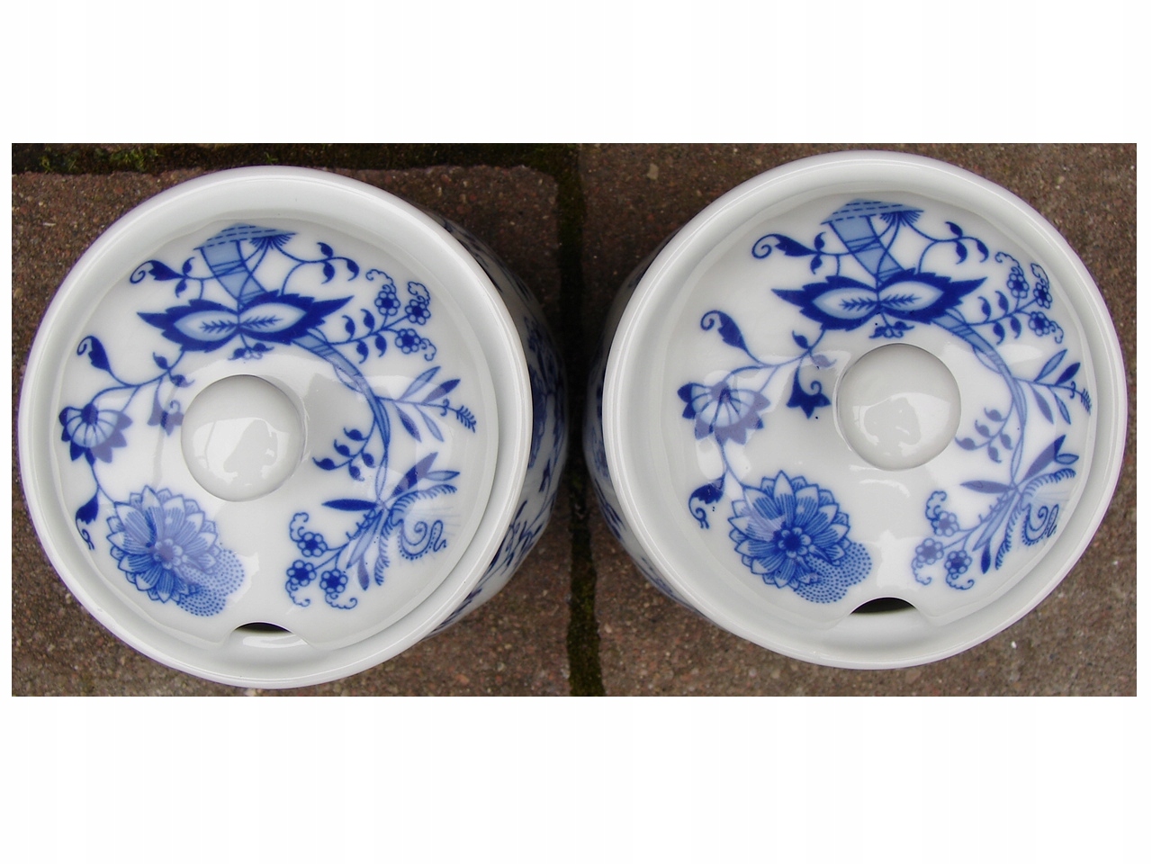 Набор из двух контейнеров для мармелада и варенья. Предметы из фарфора, украшенные луковичным узором и выпуклым волнистым узором под глазурью.