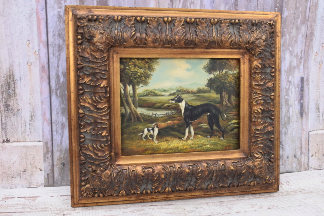 Дві мисливські собаки - собаки - картина маслом - золота рамка 47x42