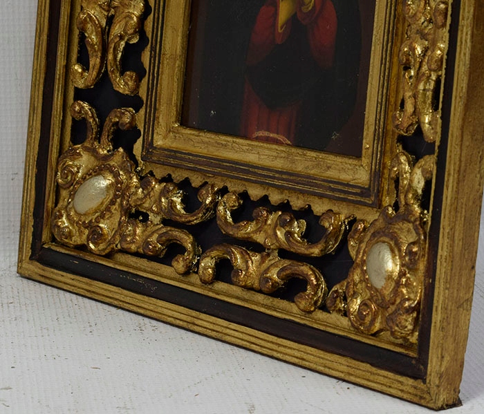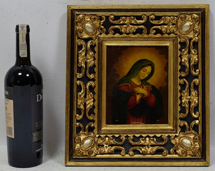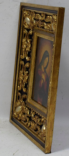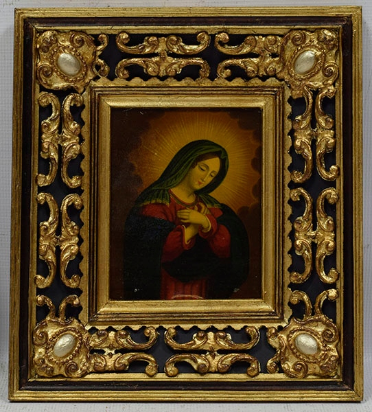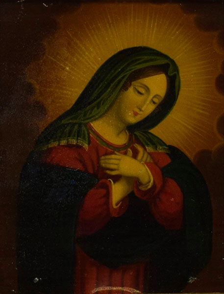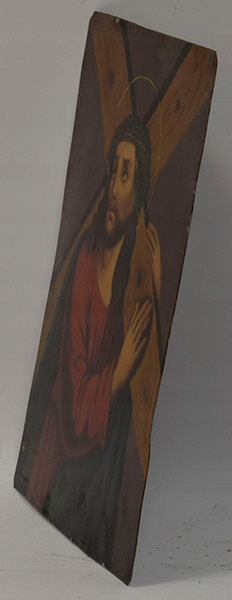Две старинные картины маслом, написанные на листе металла, изображают Иисуса Христа, несущего крест, и Деву Марию.