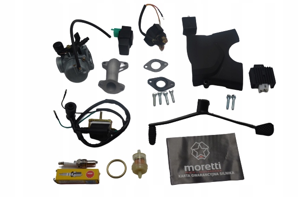 Опция с карбюратором и модулем зажигания, регулятором напряжения, стартером реле, катушка зажигания, топливный фильтр, воздушный фильтр, дополнительная свеча зажигания NGK, прокладка глушителя + 100 зл.