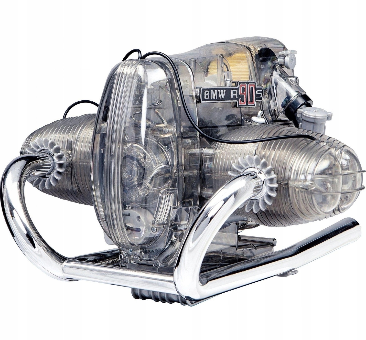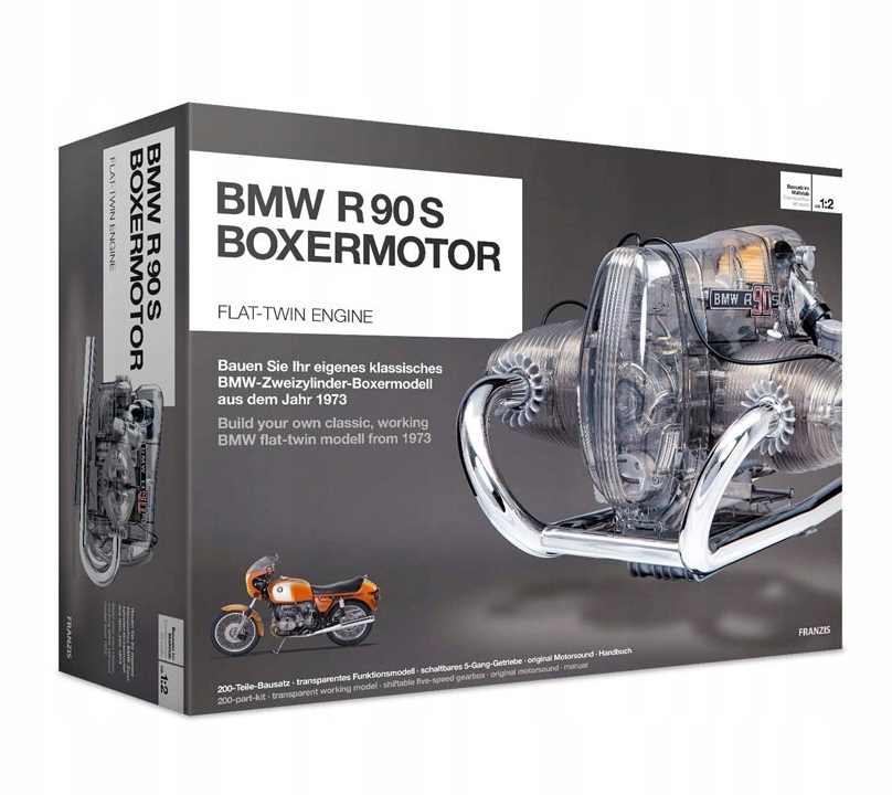 Комплект модели BMW R90S Boxer позволяет собрать рабочую копию двигателя Boxer с 5-ступенчатой коробкой передач. Он состоит примерно из 200 элементов и не требует использования клея. Сборка обеспечивает 3-4 часа развлечения, а после сборки можно увидеть, как работают коленвал, цилиндр, поршень и коробка передач. Светодиоды имитируют искры зажигания, добавляя реалистичности. Прозрачная конструкция позволяет наблюдать за внутренней частью двигателя во время установки и эксплуатации. Модель отсылает к легендарному мотоциклу BMW R90S 1970-х годов, который впервые использовал 5-ступенчатую коробку передач и добился успехов в гонках. В комплект входит 120-страничная книга, содержащая историю мотоцикла и подробную пошаговую инструкцию по сборке.
