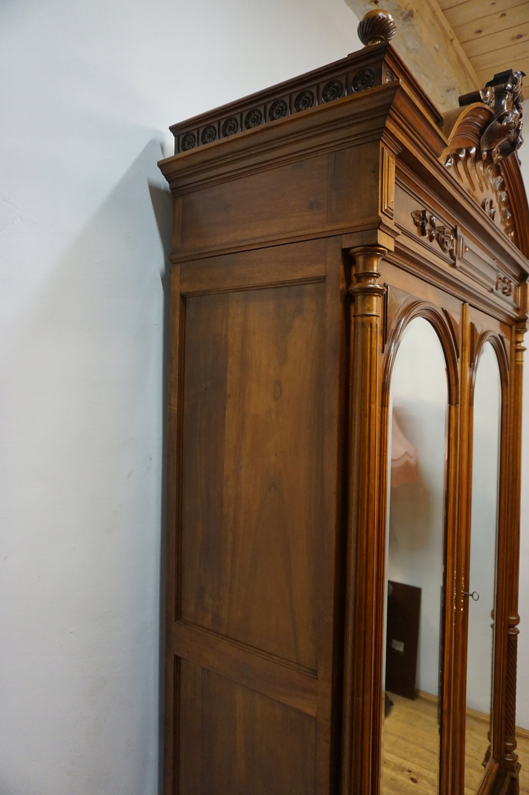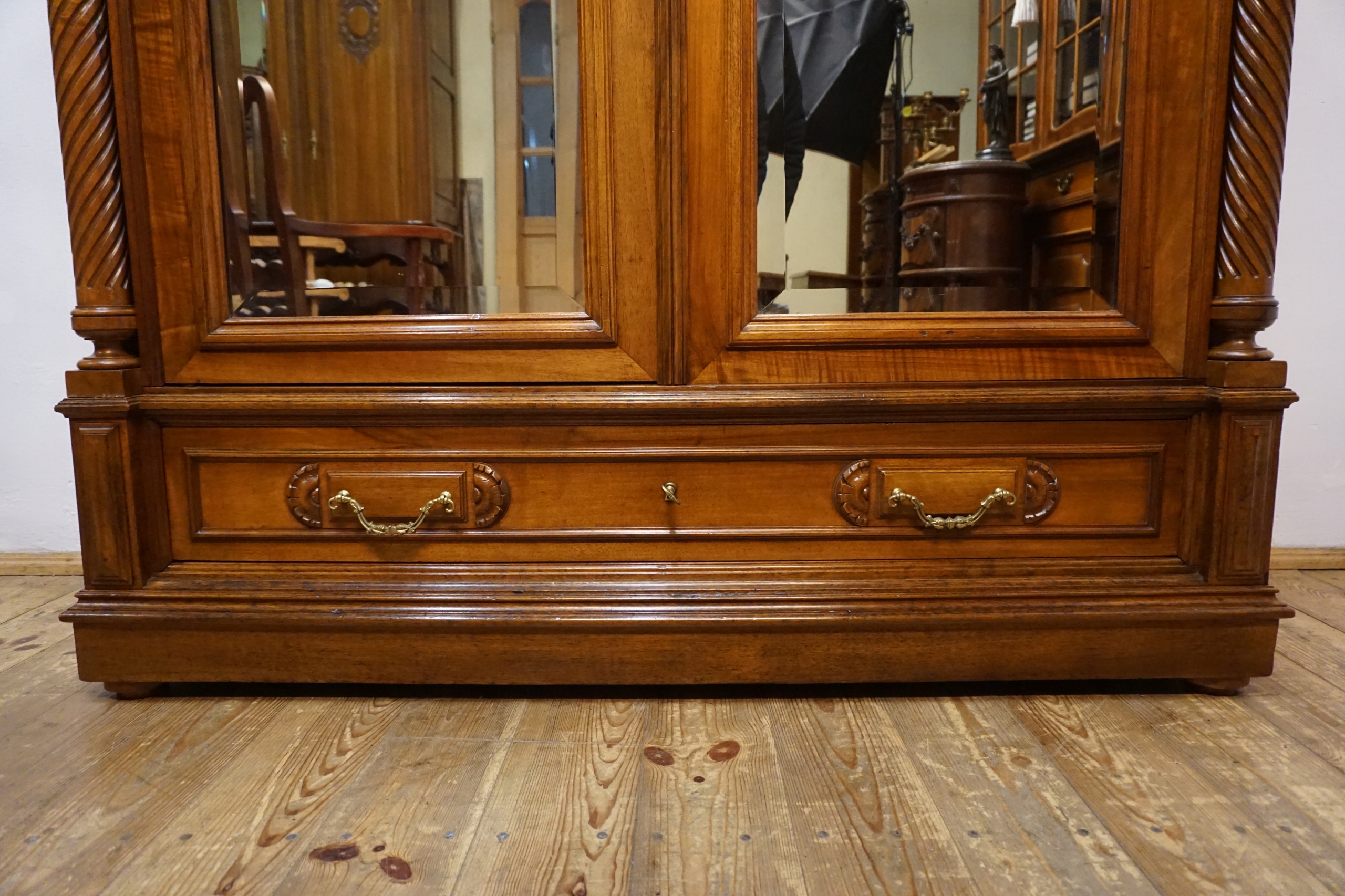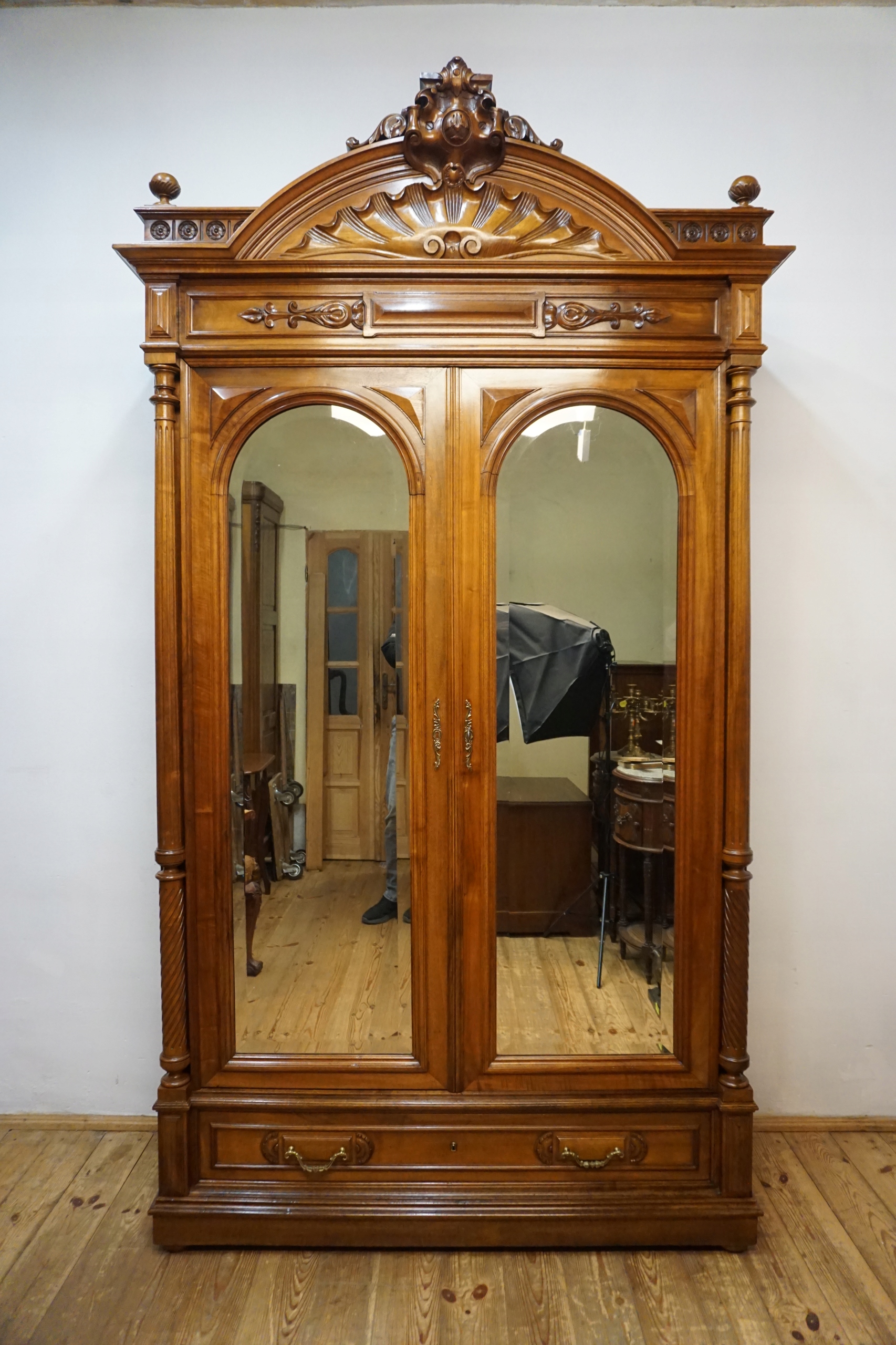 Шкаф впечатляет богато резным удлинением, гармоничными линиями и сбалансированными пропорциями, характерными для лучших образцов столярного мастерства. Двойные двери с элегантно закругленными зеркалами придают ему легкость и неподвластный времени класс, прекрасно освещая интерьер комнаты, отражая свет. Прочный, вместительный нижний ящик с декоративными ручками завершает все, предлагая как функциональность, так и декоративность.