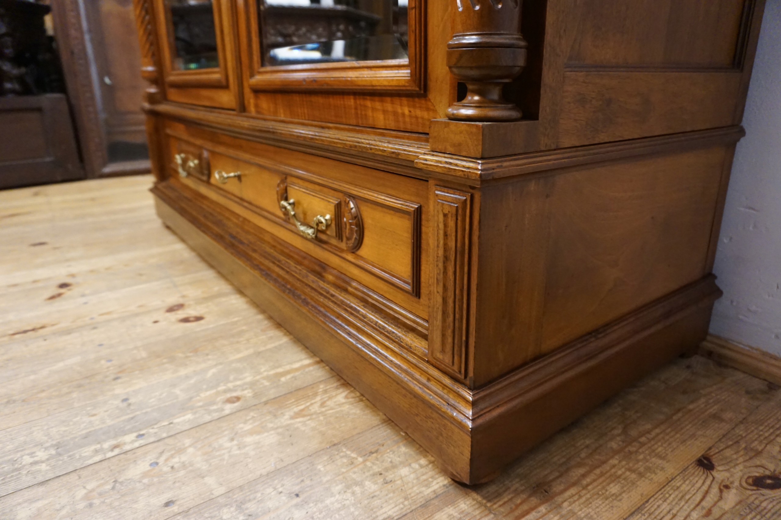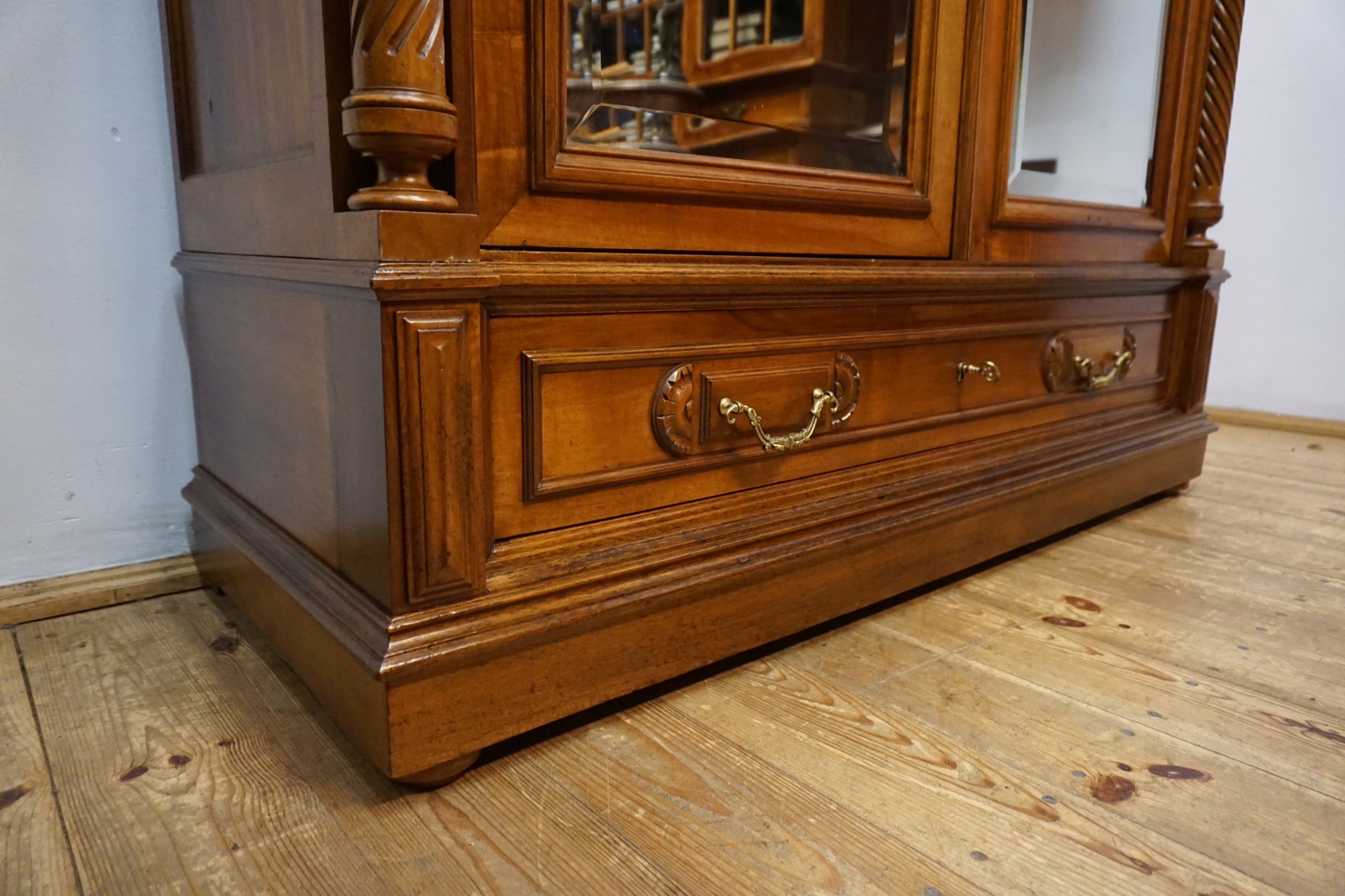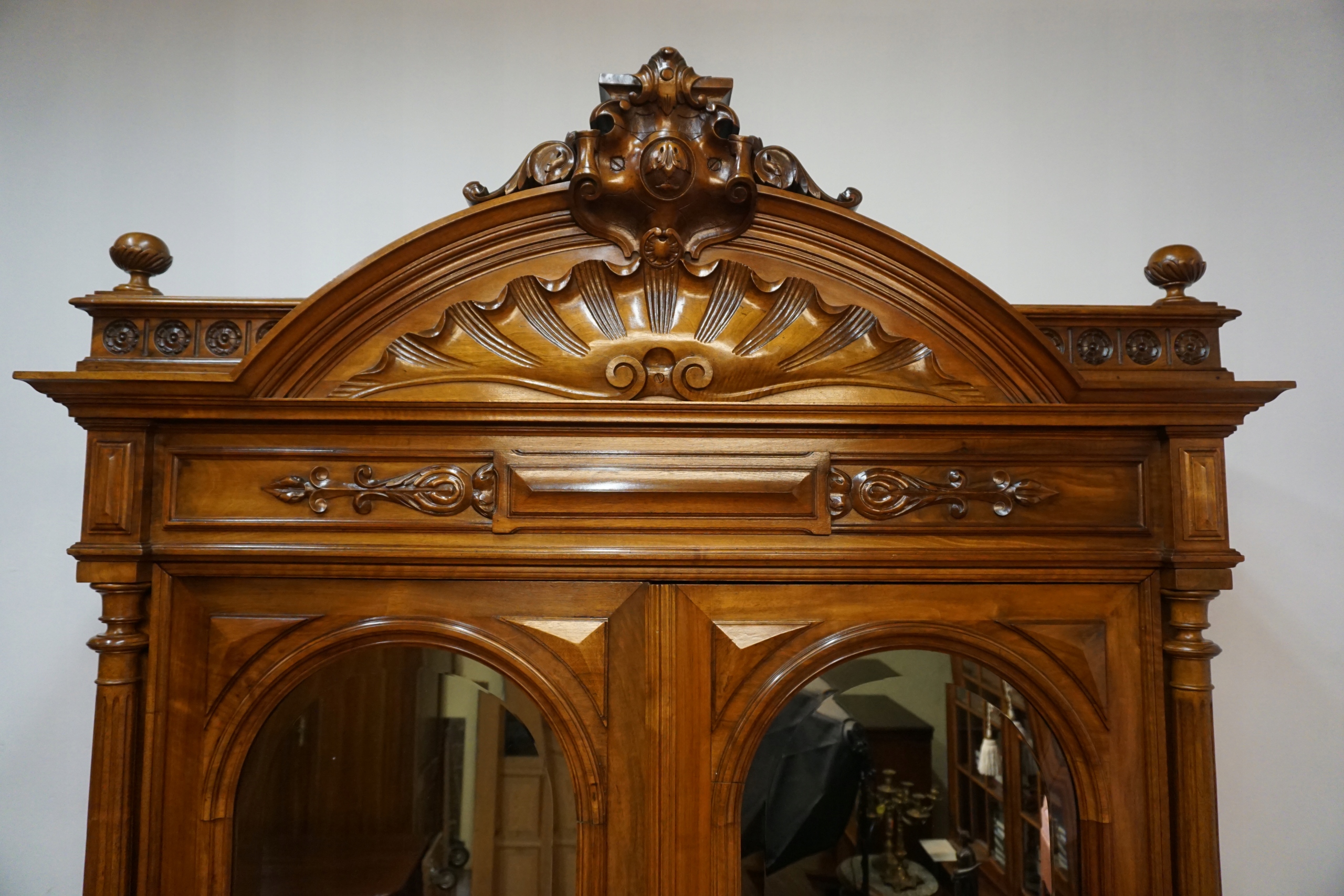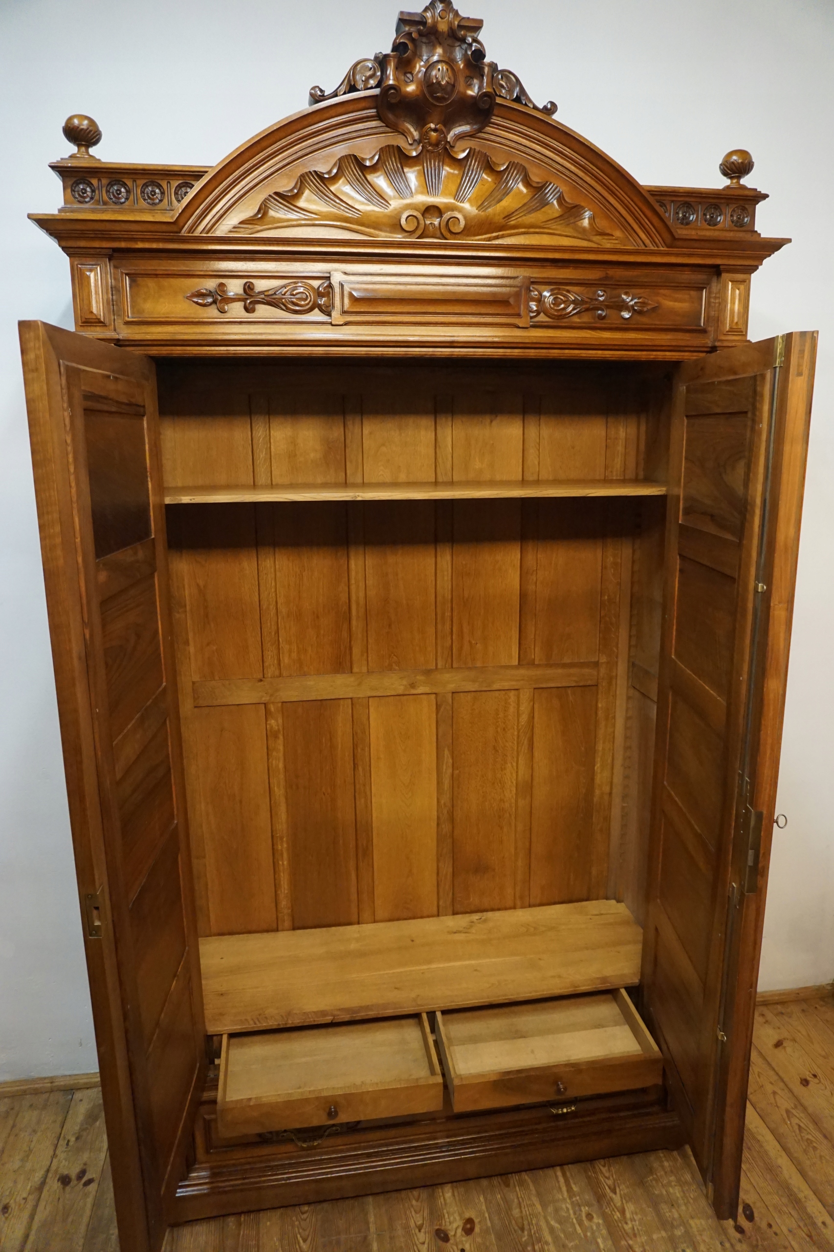 Шкаф впечатляет богато резным удлинением, гармоничными линиями и сбалансированными пропорциями, характерными для лучших образцов столярного мастерства. Двойные двери с элегантно закругленными зеркалами придают ему легкость и неподвластный времени класс, прекрасно освещая интерьер комнаты, отражая свет. Прочный, вместительный нижний ящик с декоративными ручками завершает все, предлагая как функциональность, так и декоративность.