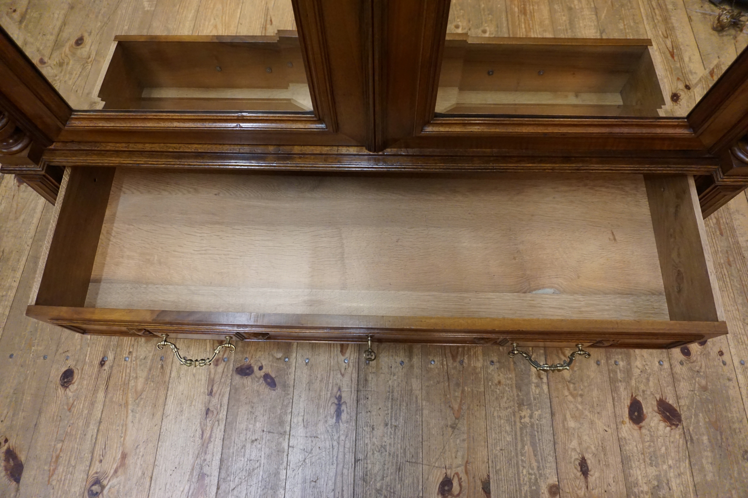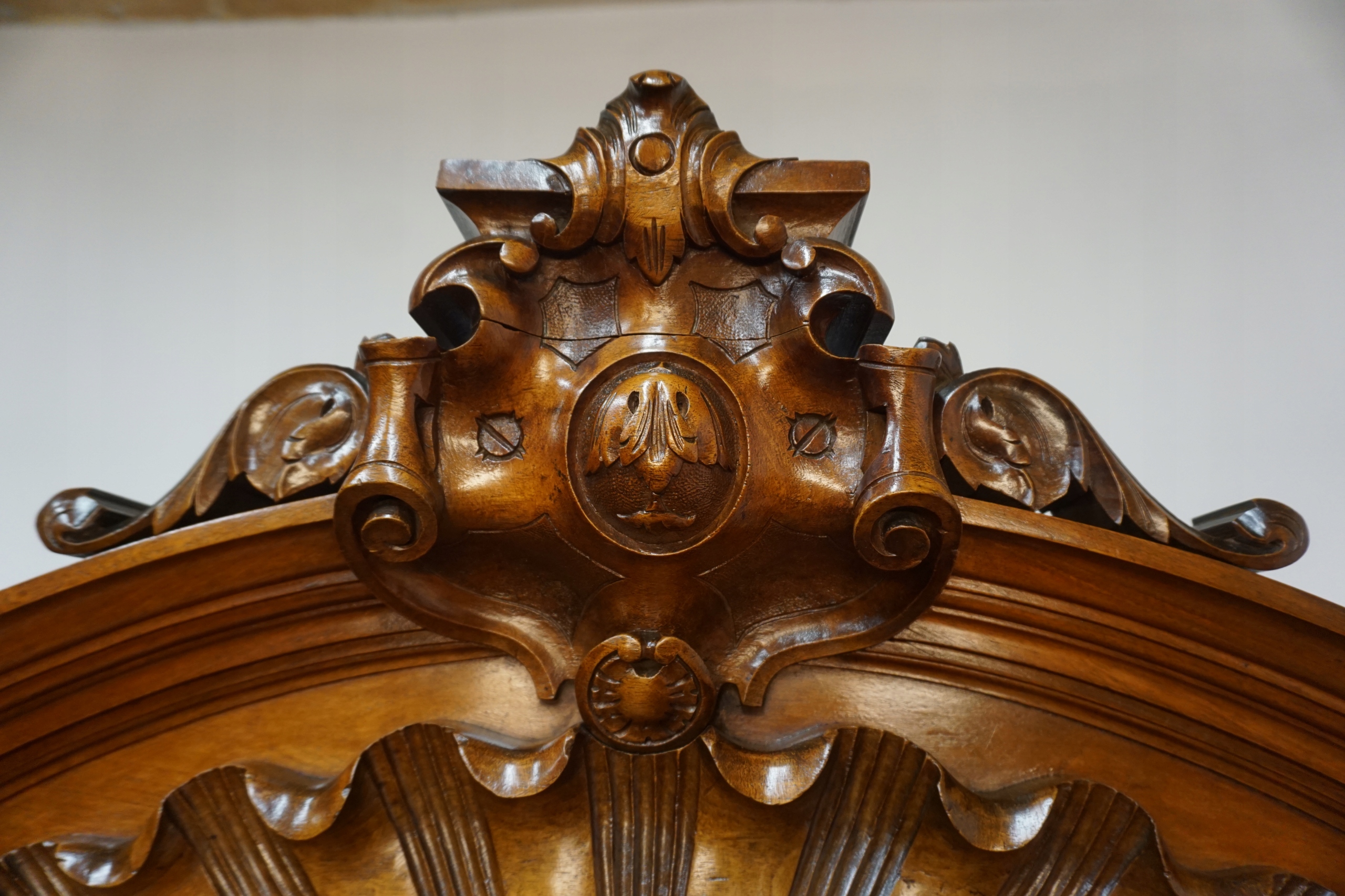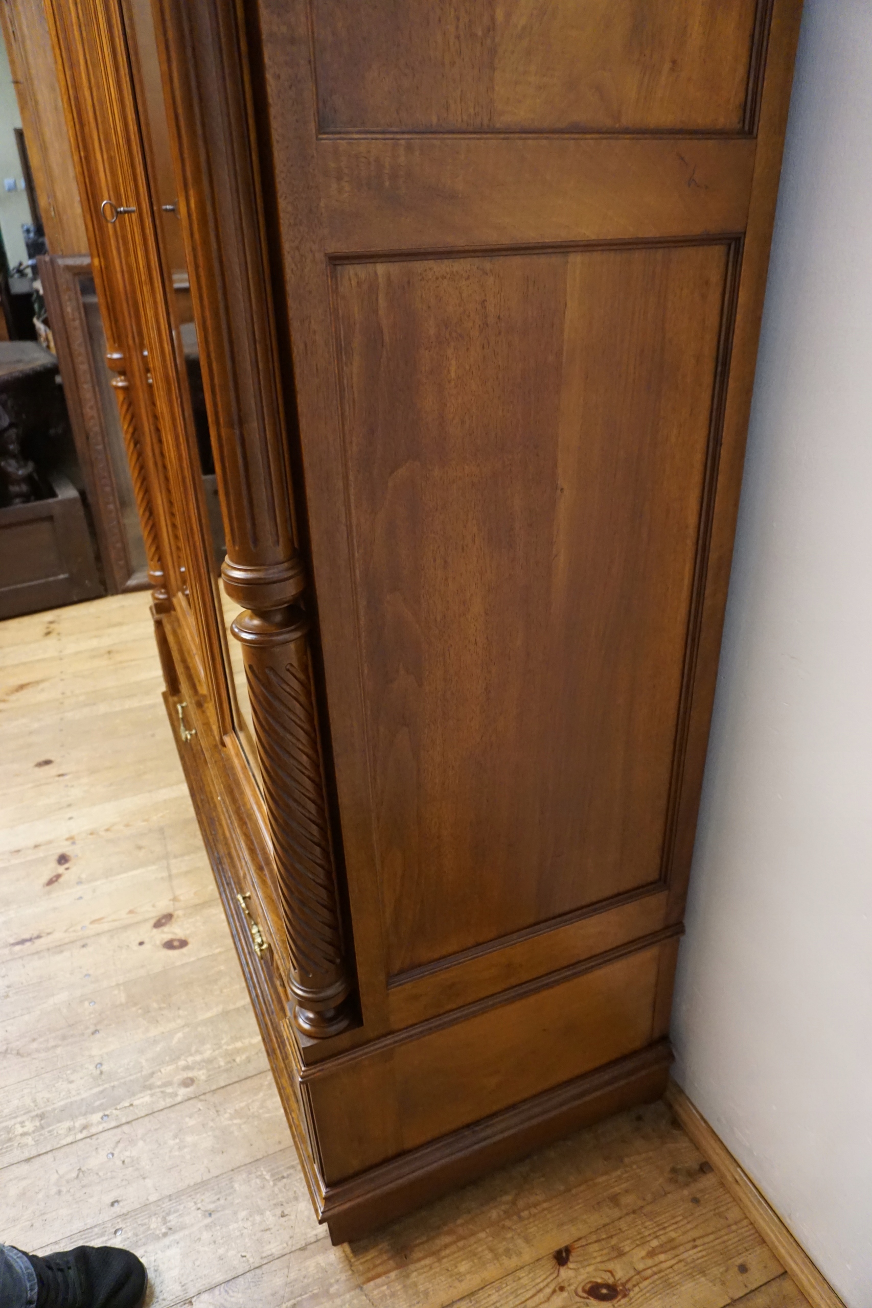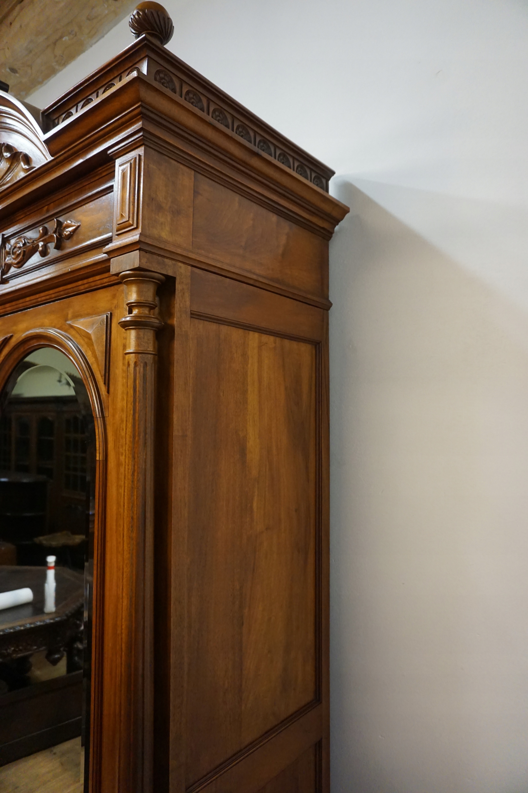 Уникальный шкаф из массива орехового дерева, тщательно отреставрированный с полным уважением к своему историческому характеру, является настоящей жемчужиной среди антикварной мебели. Реставрация была проведена с вниманием к каждой детали, благодаря чему была сохранена оригинальная благородная патина – свидетельство естественного старения древесины и ее подлинности. Все покрыто роскошным воском, который придает мебели тонкий шелковистый блеск и подчеркивает глубину текстуры ореха.