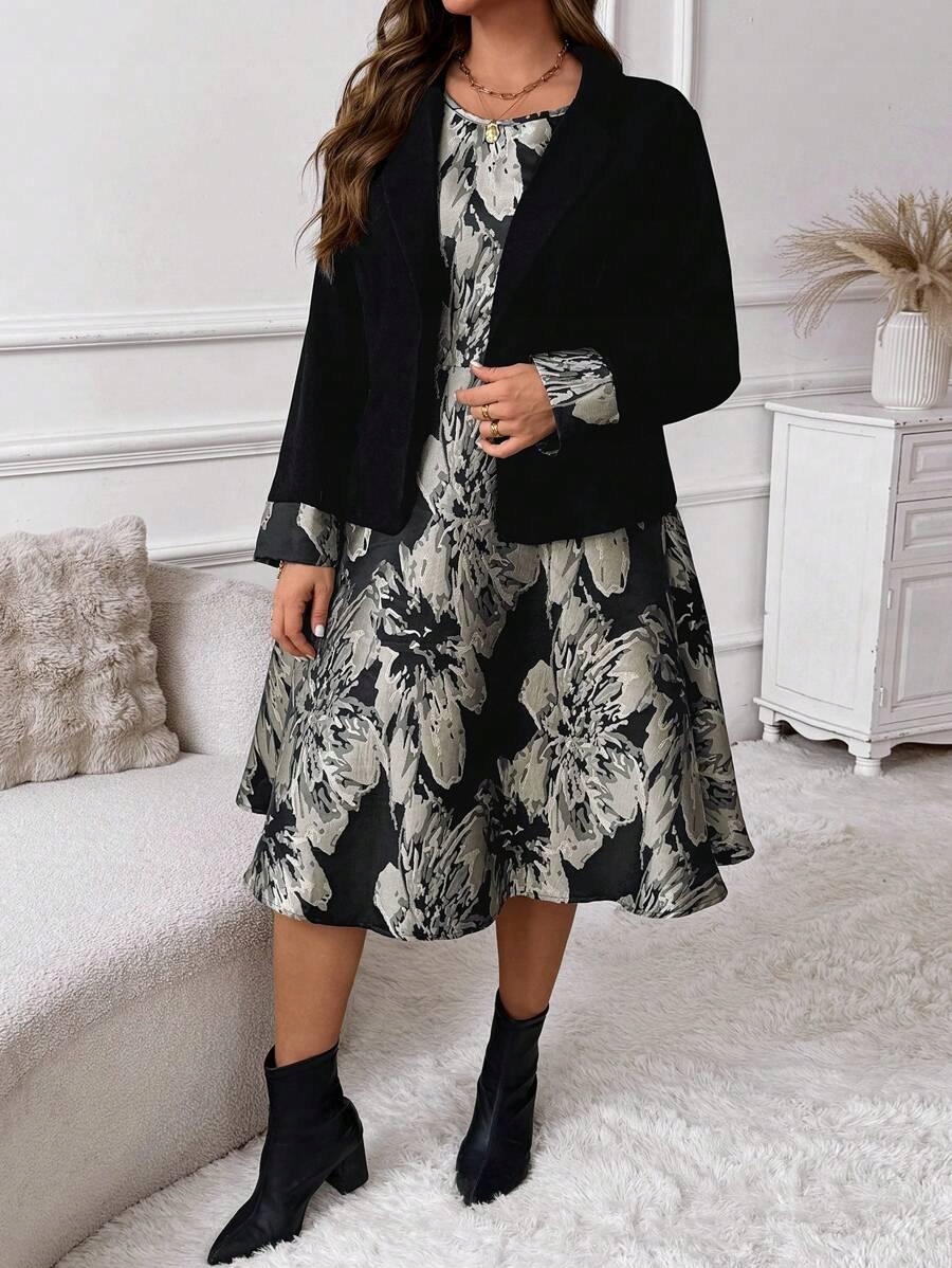 Два -части черно -миди -куртка Set Shein 48 платье цветов