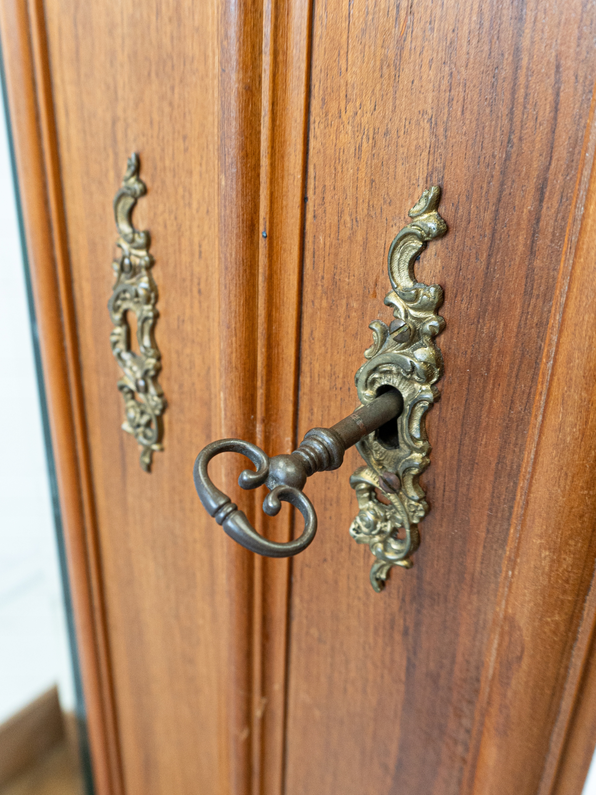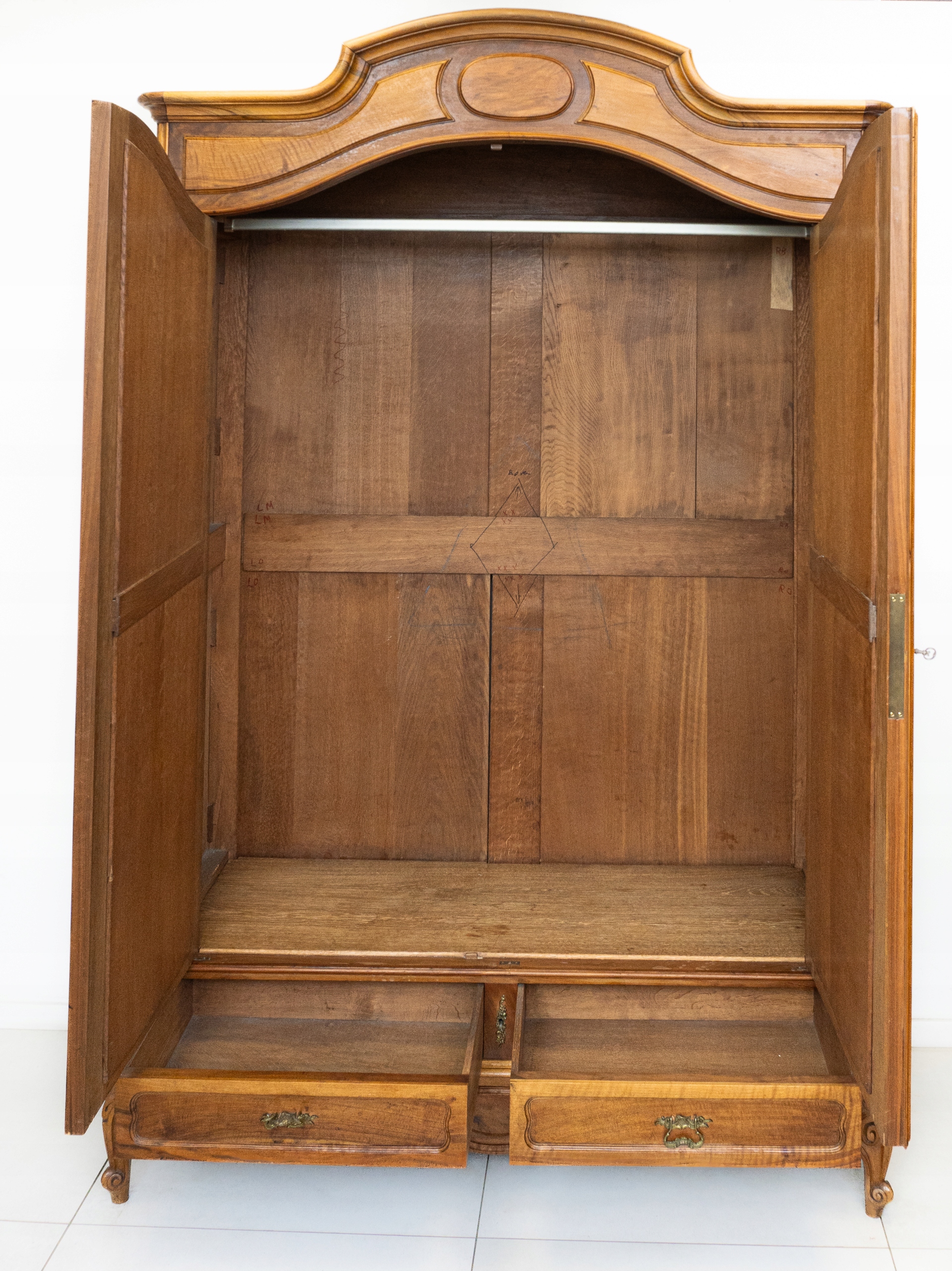 Два -турский гардероб. Он сделан из арахисового дерева в стиле Луи в 1899 году. Очень красиво, хотя показывает признаки использования. Зеркала оригинальны, очарованы, но с течением времени видно. В дверной полосе есть дефект. Есть сильная грязь справа. Замок функционален с ключом в наборе. Внутри есть палка. Состояние гардероба подробно показано на картинках. Он раздевается и придет к новому владельцу в элементах. Она готова вставить.