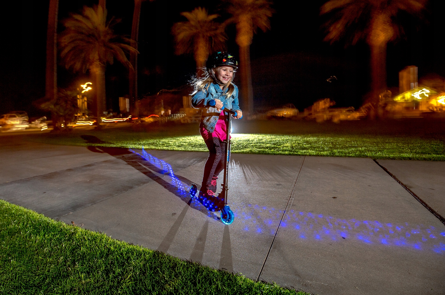 Складное рулевое колесо для удобства хранения и транспортировки. Палуба с схваченной лентой и ручкой TPR для дополнительной безопасности. Задний тормоз и световой раму обеспечивают управление. Светодиодные колеса, прикрепленные к движению.