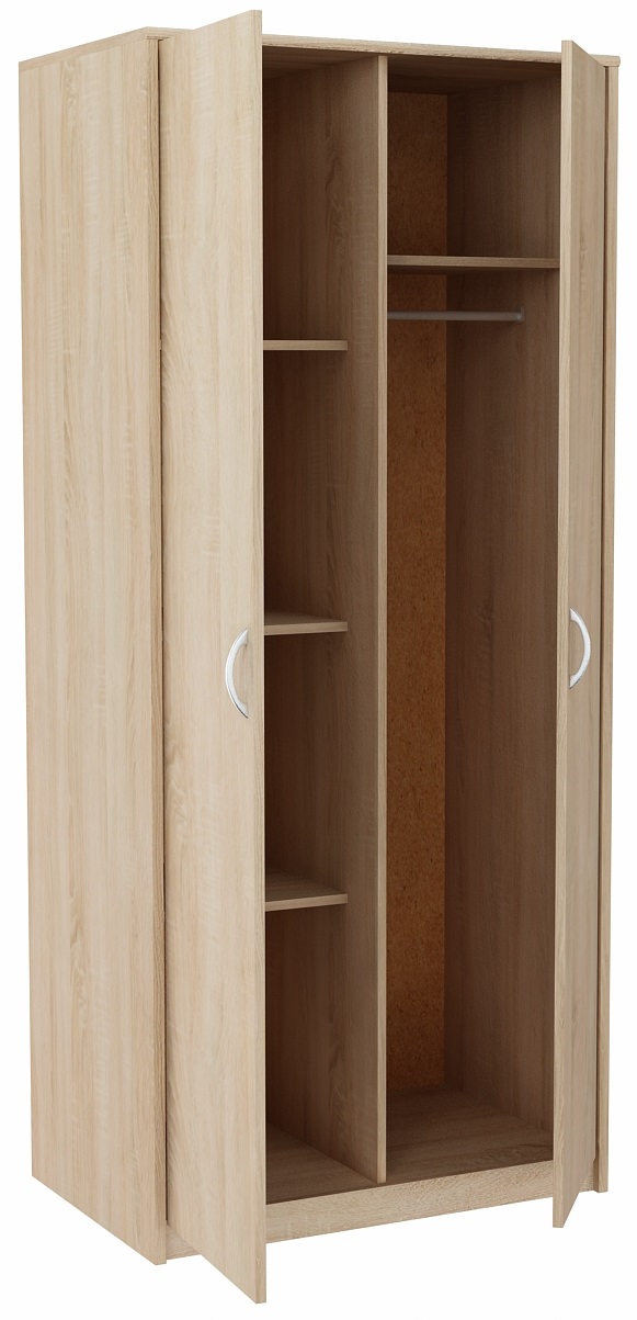 Шкаф 2Д4П разделен на две части. Левая часть имеет 3 регулируемые полки. В правой части есть полка и перекладина внизу, на которой можно повесить одежду.