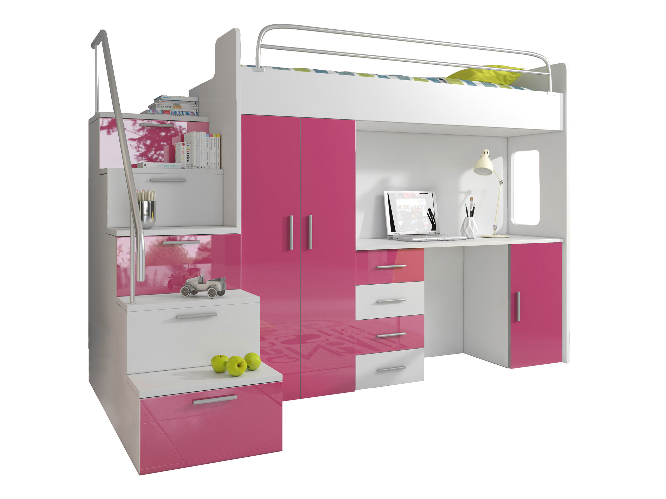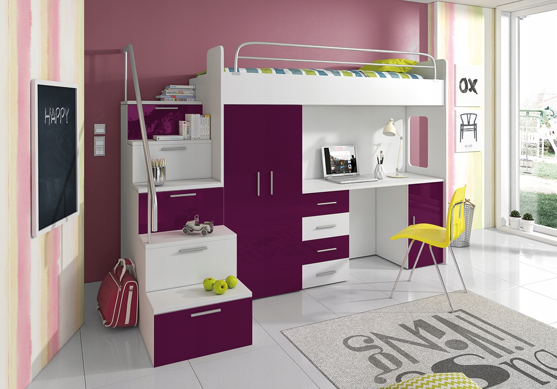 Кровать отличается современным дизайном и точным качеством изготовления, обеспечивая исключительно хороший сон и гарантию безопасности и уверенности в том, что ваш ребенок проснется отдохнувшим. Фасады гарнитура выполнены из глянцевого мебельного МДФ насыщенных цветов, что позволит подобрать мебель к любому помещению. Верхняя спальная поверхность и ступеньки рядом с кроватью оборудованы перилами, которые защитят ребенка от выпадения.