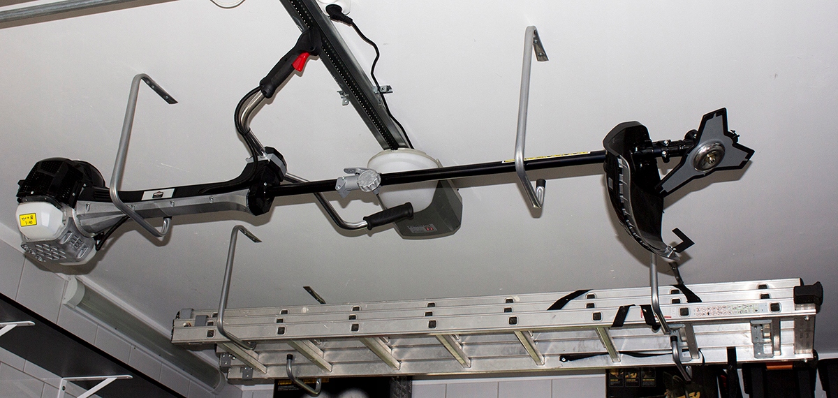 Крючки, крепящиеся к потолку или полкам, на которых можно удачно хранить садовый инвентарь или спортивный инвентарь.