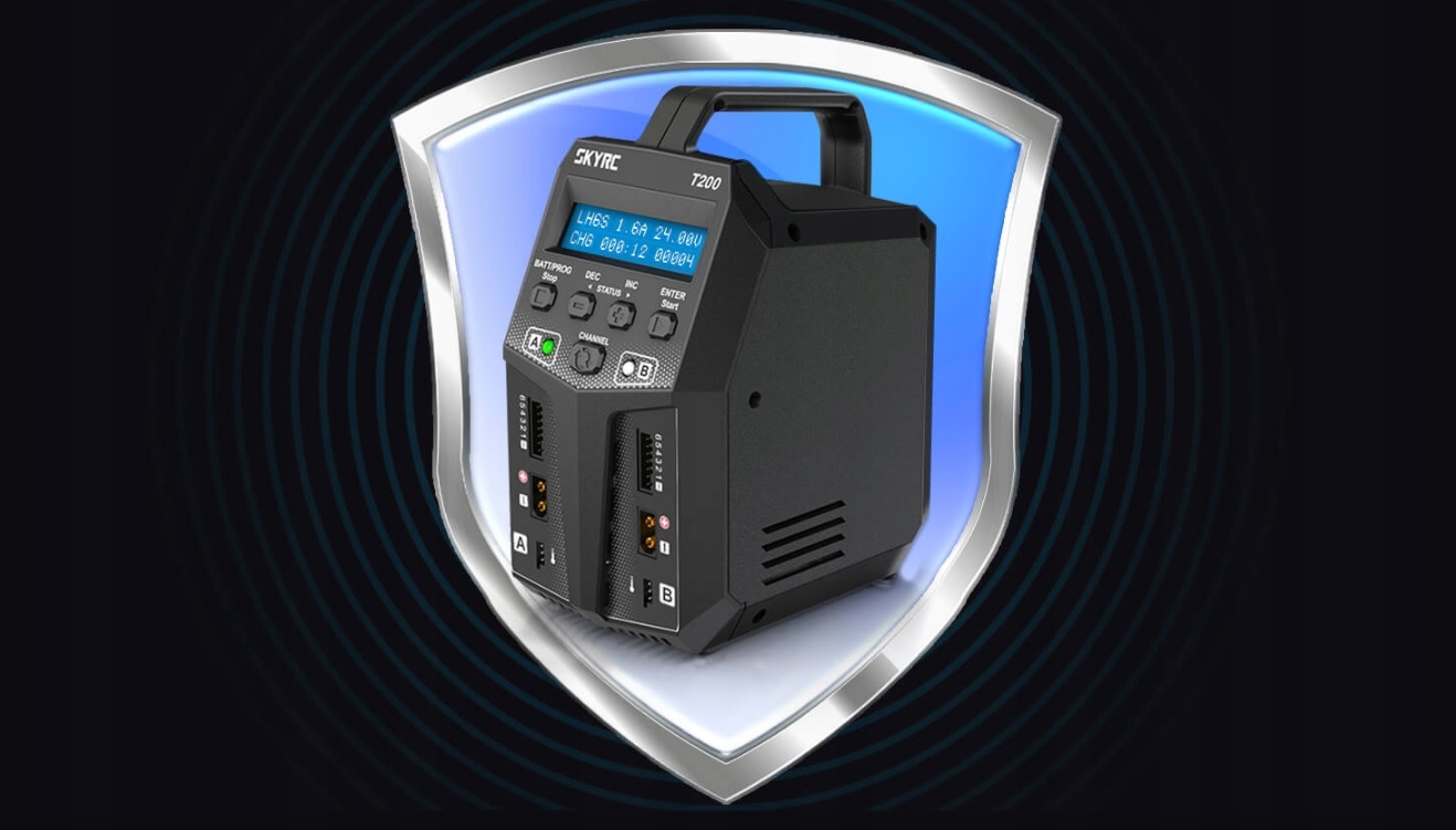 Зарядное устройство SkyRC T200 имеет самую компактную конструкцию и занимает столько же места, как пара аккумуляторов. Зарядное устройство выдает 100 Вт встроенной мощности через каждую цепь зарядки.