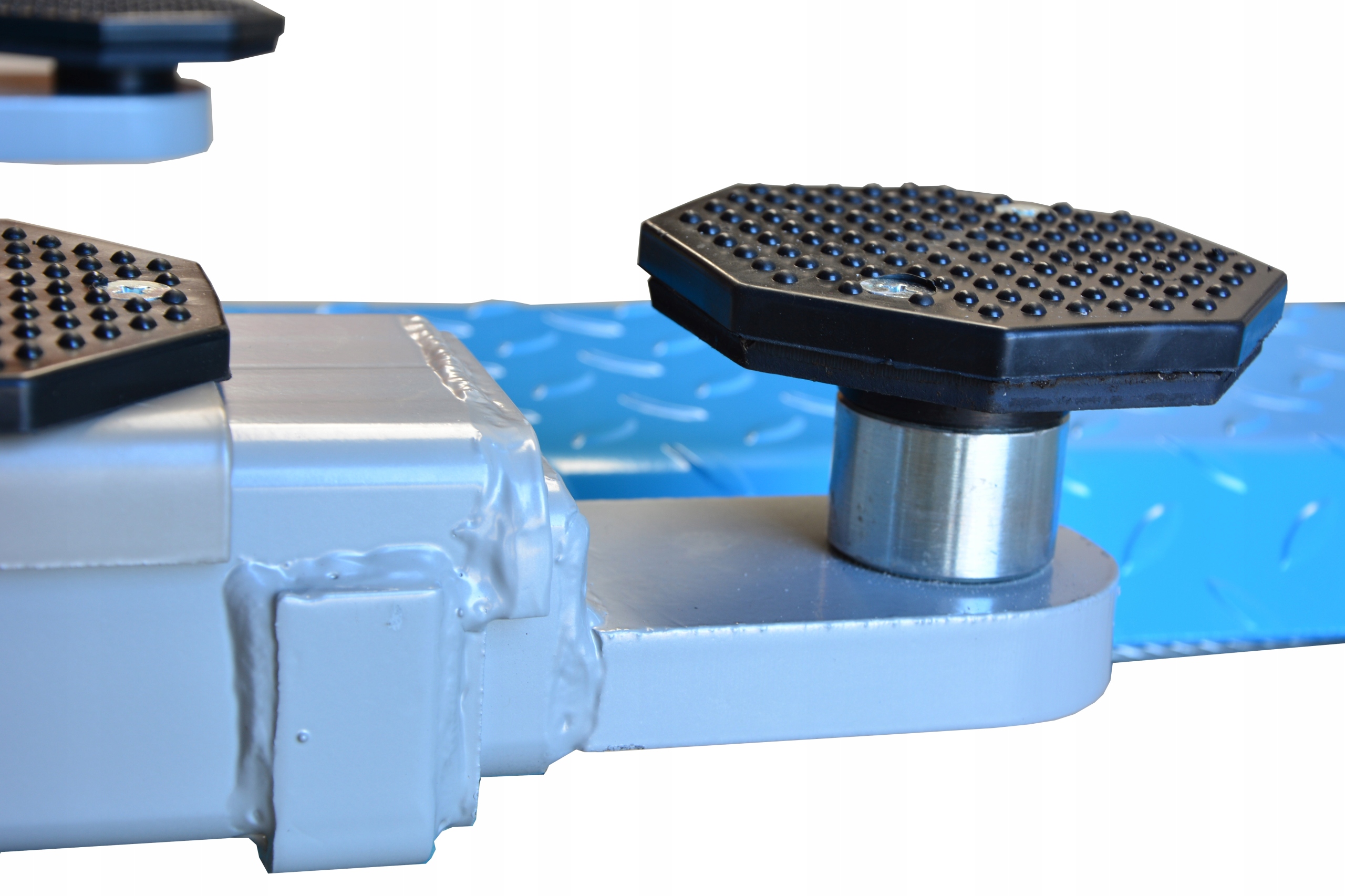 Подъемник оснащен резиновыми подушками и набором удлинителей, благодаря которым мы можем подогнать их высоту под поднимаемый автомобиль.