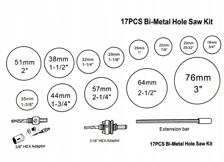 ►13 Bi -Metalal Holenters: 19, 20, 22, 25, 29, 32, 35, 38, 44, 51, 57, 64, 76 мм