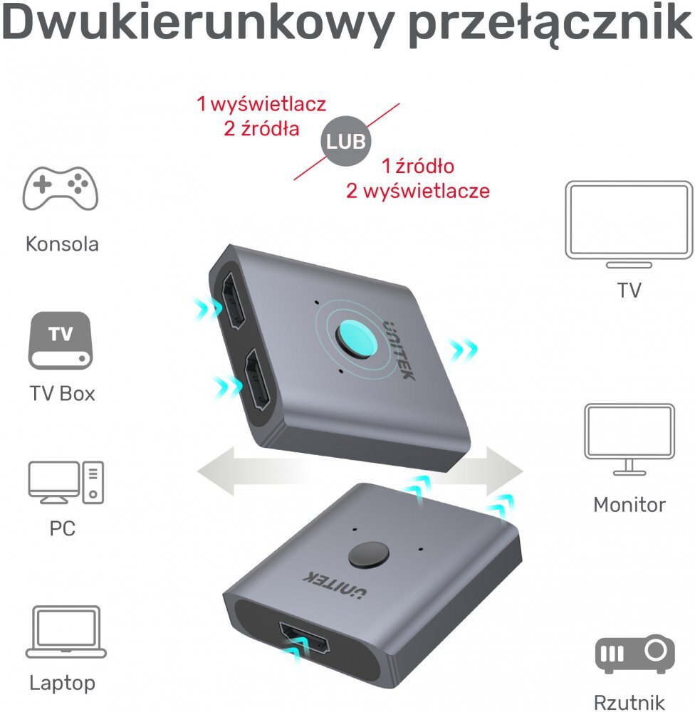 - Поскольку это двунаправленный переключатель, он позволяет подключать два устройства с портом HDMI к одному дисплею HDMI, например, телеприставку и ТВ-приставку, и наоборот — два дисплея к одному сигналу HDMI источник, например, монитор и проектор. И все это без неудобных манипуляций с кабелями.