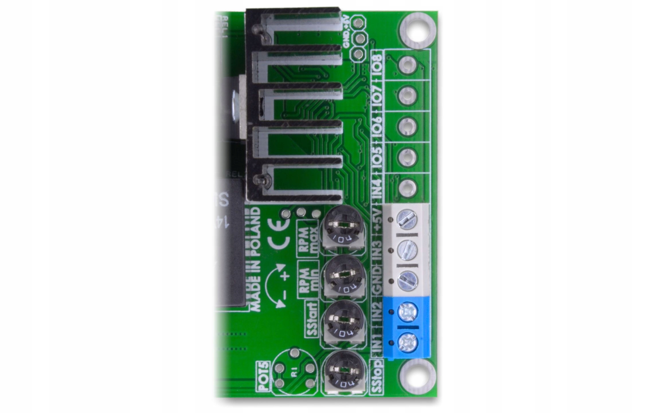 - регулировка минимальной скорости (от -50% до 50%) - типовой двигатель начинает работать с 5-15% мощности, система позволяет устанавливать минимальное значение мощности индивидуально для каждого двигателя, отрицательное значение означает, что мы можем настроить запуск подключенного двигателя только после превышения установленного минимального значения (например, при управляющем напряжении 0-5 В, установка -10%, двигатель начнет работать при 0,5В)