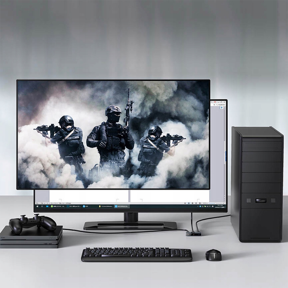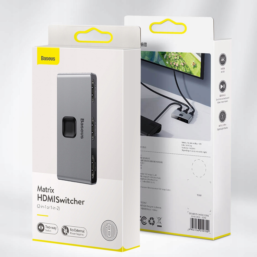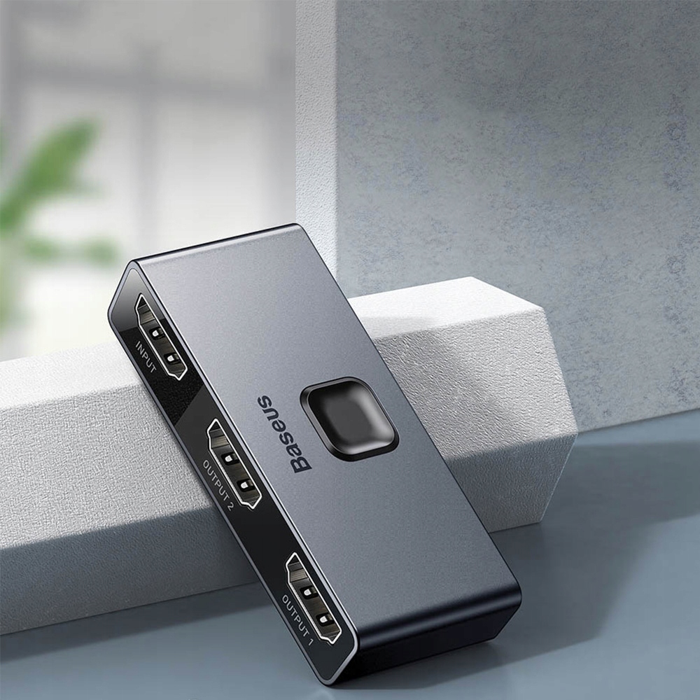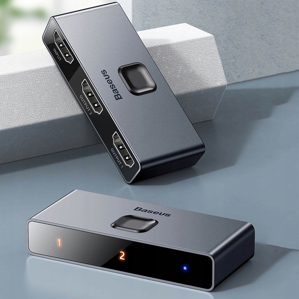 Switcher/Splitter Baseus Matrix — это продукт, который позволяет разделить сигнал HDMI. Он имеет два применения: он позволяет подключать два дисплея к одному источнику изображения или двум устройствам, например консоль, компьютер или декодер на один монитор. Сигнал переключается с помощью одной кнопки, а текущее работающее устройство индицируется диодами, расположенными спереди. Адаптер поддерживает разрешение до 4к/60Гц без потери качества, а благодаря функции форматирования звука передаваемый звук остается в высочайшем качестве. Изделие не требует дополнительного источника питания или установки – работает сразу после подключения. Благодаря небольшому размеру и элегантному дизайну он прекрасно впишется в любой интерьер.